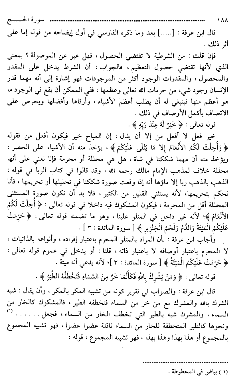وأجاب ابن عرفة: بأن المراد بالمتلو المحرم باعتبار أفراده، وأنواعه بالذاتيات، لا المحرم باعتبار أوصافه لَا باعتبار ذاته، قلنا: أو يدخل في عموم قوله تعالى: (حُرِّمَتْ عَلَيْكُمُ الْمَيْتَةُ)؛ لأنه يدعي أنه ميتة.