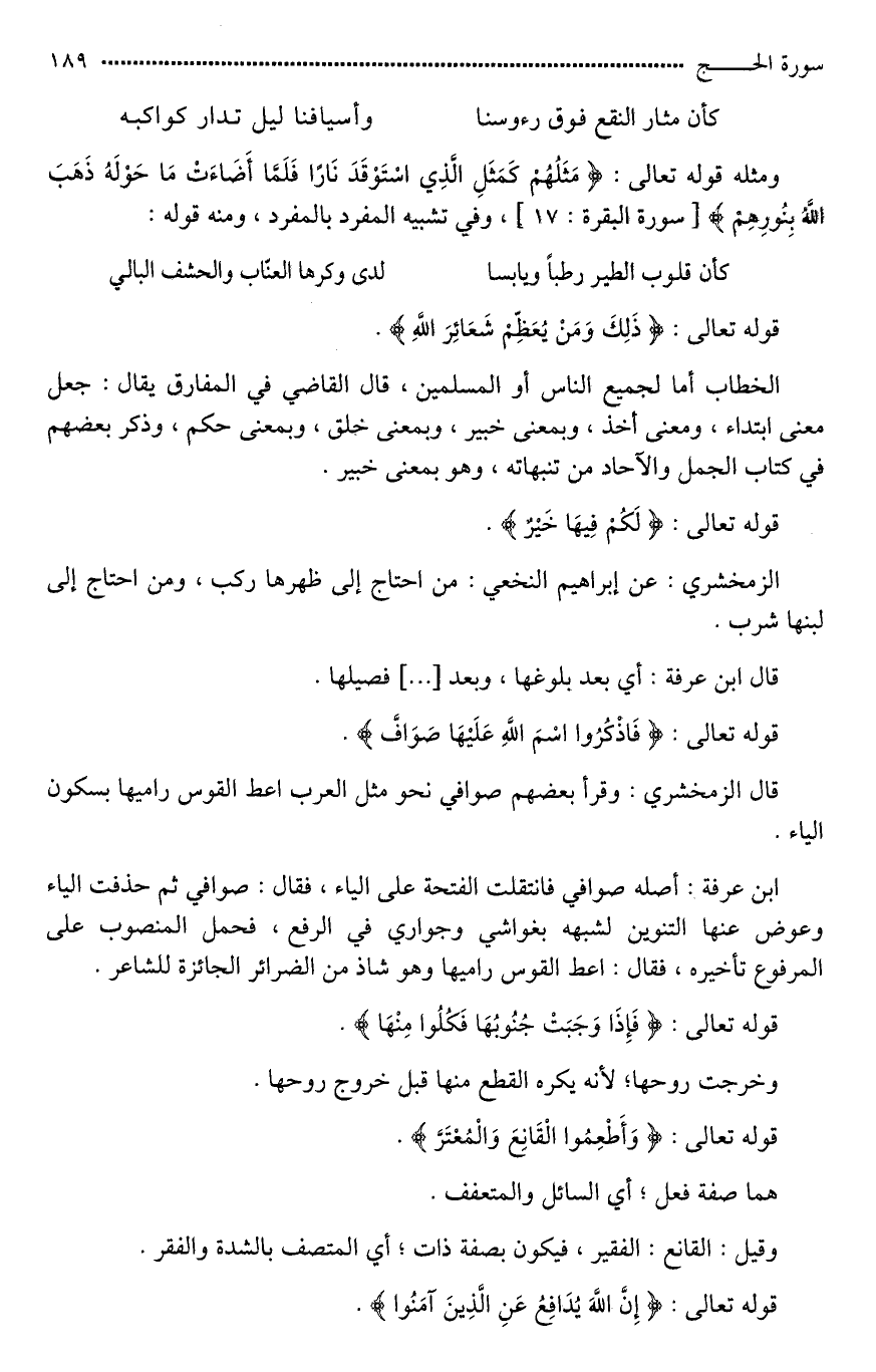 ابن عرفة: أصله صوافي فانتقلت الفتحة إلى الياء، فقال: صوافي ثم حذفت الياء وعوض عنها التنوين لشبهه بغواشي وجواري في الرفع، فحمل المنصوب على المرفوع تأخيره، فقال: اعط [القوس باريها*] وهو شاذ من الضرائر الجائزة للشاعر.