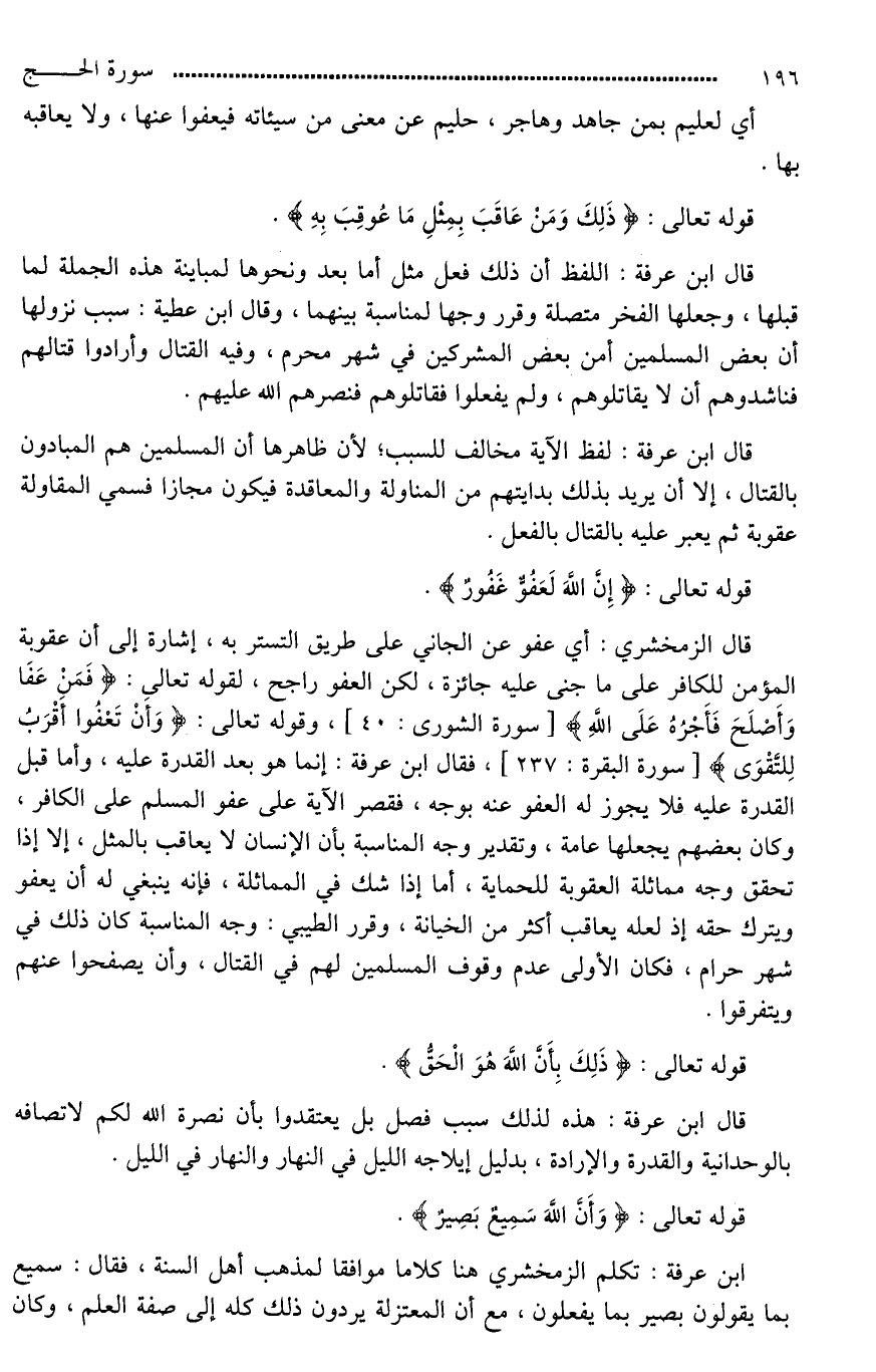 قال الزمخشري: أي عفو عن الجاني على طريق التستر به، إشارة إلى أن عقوبة المؤمن للكافر على ما جنى عليه جائزة، لكن العفو راجح، لقوله تعالى: (فَمَنْ عَفَا وَأَصْلَحَ فَأَجْرُهُ عَلَى اللَّهِ)، وقوله تعالى: (وَأنْ تَعْفُوا أَقْرَبُ لِلتَّقْوَى)، فقال ابن عرفة: إنما هو بعد القدرة عليه، وأما قبل القدرة عليه فلا يجوز له العفو عنه بوجه، فقصر الآية على عفو المسلم على الكافر، وكان بعضهم يجعلها عامة، وتقدير وجه المناسبة بأن الإنسان لَا يعاقب بالمثل، إلا إذا تحقق وجه مماثلة العقوبة [للجناية*]، أما إذا شك في المماثلة، فإنه ينبغي له أن يعفو ويترك حقه إذ لعله يعاقب أكثر من الخيانة، وقرر الطيبي: وجه المناسبة كان ذلك في شهر حرام، فكان الأولى عدم وقوف المسلمين لهم في القتال، وأن يصفحوا عنهم ويتفرقوا.