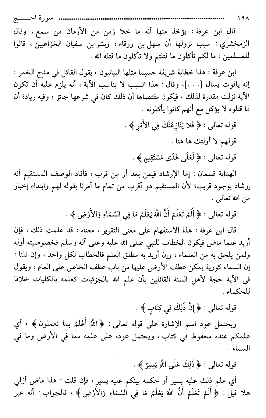 ابن عرفة: هذا خطابة شريفة حسبما مثلها البيانيون، يقول القائل في مدح الخمر: إنه ياقوت يسال ... ، وقال: هذا السبب لَا يناسب الآية، إنه يلزم عليه أن تكون الآية نزلت مقدرة لذلك، فيكون مقتضاها أن ذلك كان في [شرعنا جائزا*]، وفيه زيادة أن ما قتلوه لَا يؤكل مع أنهم كانوا يأكلونه.