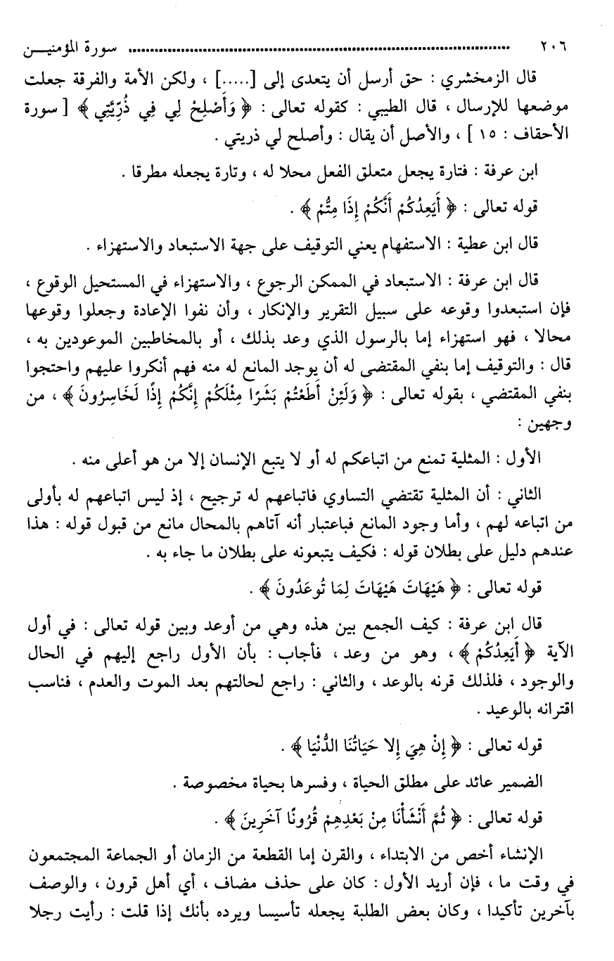 قال ابن عرفة: الاستبعاد في الممكن الرجوع، والاستهزاء في المستحيل الوقوع، فإن استبعدوا وقوعه على سبيل التقرير والإنكار، وإن نفوا الإعادة وجعلوا وقوعها محالا، فهو استهزاء إما بالرسول الذي وعد بذلك، أو بالمخاطبين الموعودين به، قال: والتوقيف إما بنفي المقتضى له أن يوجد المانع له منه فهم أنكروا عليهم واحتجوا بنفي المقتضي، بقوله تعالى: (وَلَئِنْ أَطَعْتُمْ بَشَرًا مِثْلَكُمْ إِنَّكُمْ إِذًا لَخَاسِرُونَ)، من وجهين: