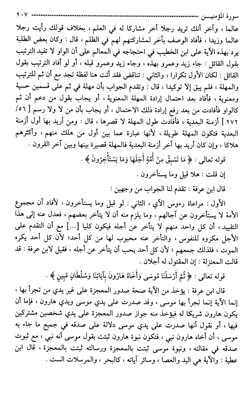 الأول: مراعاة رءوس الآي، الثاني: لو قيل وما يستأخرون، لأفاد أن مجموع الأمة لَا يستأخرون عن آجالهم، وما يلزم منه أن لَا يتأخر بعضهم، فعدل عنه إلى هذا التقييد، أن كل واحد منهم لَا يتأخر عن أجله فيكون كليا [ ... ] مع أن التقدم على الأجل مكروه للنفوس، والتأخر عنه محبوب لها من كل أحد؛ لأن كل أحد يكره الموت، فلذلك جمعهم؛ لأن كل أحد يحب أن يتأخر عن أجله، فقيل لابن عرفة: قد قالت المعتزلة: إن المقتول له أجلان.