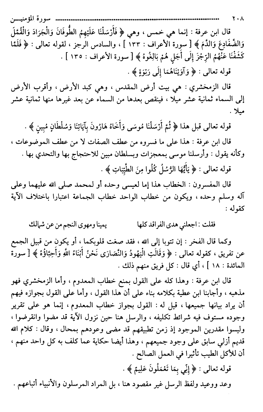قال ابن عرفة: وهذا كله على القول بمنع خطاب المعدوم، وأما الزمخشري فهو مذهبه، وأجابنا ابن عطية بكلامه بناء على أن هذا القول، وأما على القول بجوازه فيهم أن يراد بيانها جميعها، قيل له: القول بجواز خطاب المعدوم، إنما هو على تقرير وجوده مستوف فيه شرائط تكليفه، والرسل هنا حين نزول الآية قد مضوا وانقرضوا، وليسوا مقدرين الموجود إذ زمن تطبيقهم قد مضى وعودهم [محال*]، وقال: كلام الله قديم أزلي سابق على وجود جميعهم، وهذا أيضا حكاية عما كلف به كل واحد منهم، أن للأكل الطيب تأثيرا في العمل الصالح.