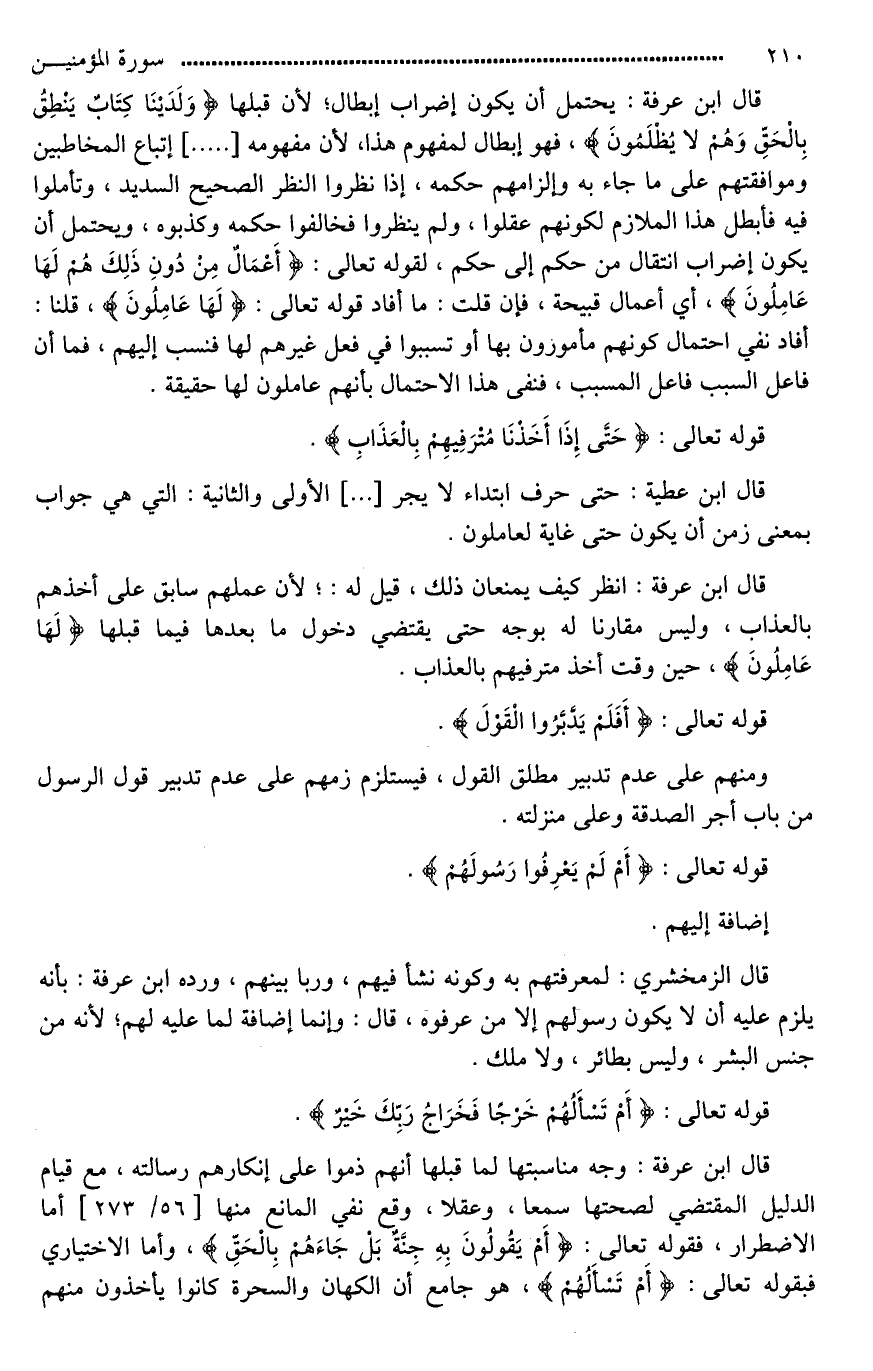 قال ابن عرفة: يحتمل أن يكون إضراب إبطال؛ لأن قبلها (وَلَدَيْنَا كِتَابٌ يَنْطِقُ بِالْحَقِّ وَهُمْ لَا يُظْلَمُونَ)، فهو إبطال لمفهوم هذا، لأن مفهومه [ ... ] إتباع المخاطبين وموافقتهم على ما جاء به وإلزامهم حكمه، إذا نظروا النظر الصحيح السديد، وتأملوا فيه فأبطل هذا الملازم لكونهم عقلوا، ولم ينظروا فخالفوا حكمه وكذبوه، ويحتمل أن يكون إضراب المال من حكم إلى حكم، لقوله تعالى: (أَعْمَالٌ مِنْ دُونِ ذَلِكَ هُم لَهَا عَامِلُونَ)، أي أعمال قبيحة، فإن قلت: ما أفاد قوله تعالى: (لَهَا عَامِلُونَ)، قلنا: أفاد نفي احتمال كونهم مأمورون بها أو تسببوا في فعل غيرهم لها فنسب إليهم، فما أن فاعل السبب فاعل المسبب، فنفى هذا الاحتمال بأنهم عاملون لها حقيقة.