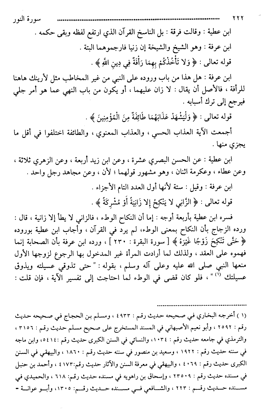 فسره ابن عطية بأربعة أوجه: إما أن النكاح الوطء، فالزاني لَا يطأ إلا زانية، قال: ورده الزجاج بأن النكاح بمعنى الوطء، لم يرد في القرآن، وأجاب ابن عطية بوروده (حَتى تَنْكِحَ زَوْجًا غَيْرَهُ)، ورده ابن عرفة بأن الصحابة إنما فهموه على العقد، ولذلك لما أرادت المرأة غير المدخول بها الرجوع لزوجها الأول منعها النبي صلى الله عليه وعلى آله وسلم، بقوله: "حَتَّى تَذُوقِي عُسَيْلَتَهُ وَيَذُوقَ عُسَيْلَتَكِ"، فلو كان قضى في الوطء لما احتاجت إلى تفسير الآية، فإن قلت: