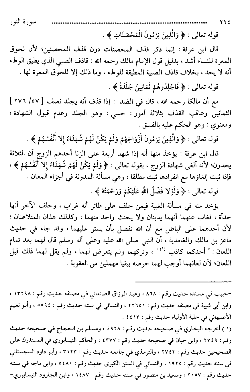 قال ابن عرفة: يؤخذ منها أنه إذا شهد أربعة على الزنا أحدهم الزوج أن الثلاثة يحدون؛ لأنه ألغى شهادة الزوج، بقوله تعالى: (وَلَم يَكُنْ لَهُمْ شُهَدَاءُ إِلَّا أنْفُسُهُمْ)، فإذا ثبت إلغاؤها مع انفرادها ثبت مطلقا، وهي مسألة المدونة في [أجزاء اللعان*].