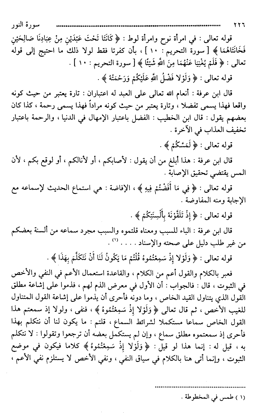 فعبر بالكلام والقول أعم من الكلام، والقاعدة استعمال الأعم في النفي والأخص في الثبوت، قال: فالجواب: أن الأول في معرض الذم لهم، فذموا على إشاعة مطلق القول الذي يتناول القيد الخاص، وما دونه فأحرى أن يذموا على إشاعة القول المتناول للغيب الأخص، ثم قال تعالى (وَلَوْلَا إِذْ سَمِعْتُمُوهُ)، فنفى، ولولا إذ سمعتم هذا القول الخاص سماعا مستكملا لشرائط السماع، قلتم: ما يكون لنا أن نتكلم بهذا فأحرى إذ سمعتموه مطلق سماع، وإن لم يستكمل بعضه أن ترجعوا وتقولوا: لا نتكلم به، قيل له: إنما هذا لو قيل: (وَلَوْلَا إِذْ سَمِعْتُمُوهُ) كلاما فيكون في موضع الثبوت، وإنما أتى هنا بالكلام في سياق النفي، ونفي الأخص لَا يستلزم نفي الأعم،