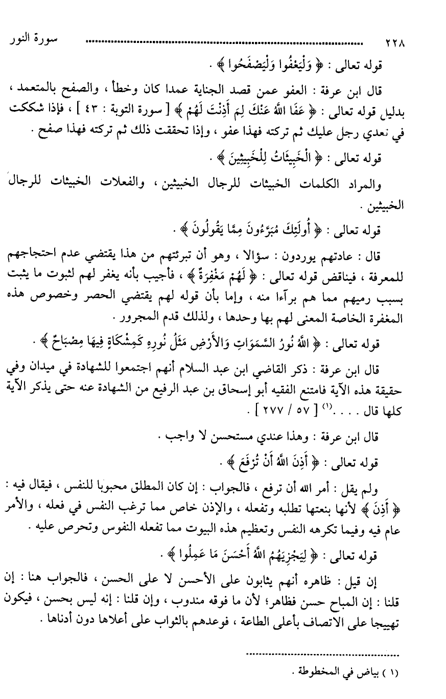 قال ابن عرفة: ذكر القاضي ابن عبد السلام أنهم اجتمعوا للشهادة في ميدان في حقيقة هذه الآية، فامتنع الفقيه أبو إسحاق بن عبد الرفيع من الشهادة عنه حتى يذكر الآية كلها قال [باقي الآيةِ صفةٌ لـ (مصباح) *].