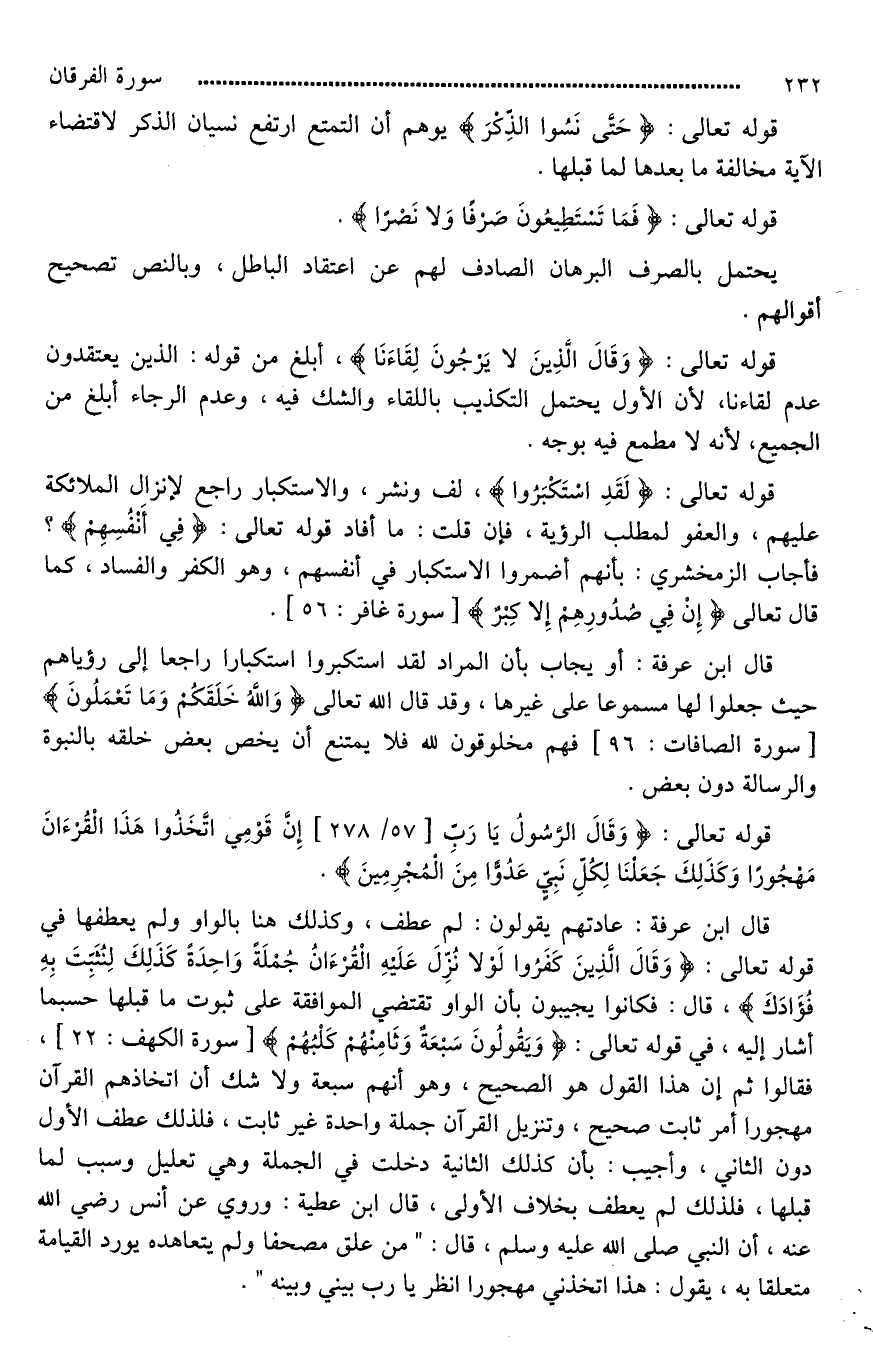 قال ابن عرفة: عادتهم يقولون: لم عطف، وكذلك هنا بالواو ولم يعطفها في قوله تعالى: (وَقَالَ الَّذِينَ كَفَرُوا لَوْلَا نُزِّلَ عَلَيْهِ الْقُرْآنُ جُمْلَةً وَاحِدَةً كَذَلِكَ لِنُثَبِّتَ بِهِ فُؤَادَكَ)، قال: فكانوا يجيبون بأن الواو تقتضي الموافقة على ثبوت ما قبلها حسبما أشار إليه، في قوله تعالى: (وَيَقُولُونَ سَبْعَةٌ وَثَامِنْهُم كَلْبُهُم)، فقالوا ثم إن هذا القول هو الصحيح، وهو أنهم سبعة ولا شك أن اتخاذهم القرآن مهجورا أمر ثابت صحيح، وتنزيل القرآن جملة واحدة غير ثابت، فلذلك عطف الأول دون الثاني، وأجيب: بأن كذلك الثانية دخلت في الجملة وهي تعليل وسبب لما قبلها، فلذلك لم يعطف بخلاف الأولى، قال ابن عطية: وروي عن أنس رضي الله عنه، أن النبي صلى الله عليه وسلم، قال: " [من علق مصحفا ولم يتعاهده جاء يوم القيامة متعلقا به يقول هذا اتخذني مَهْجُوراً افصل يا رب بيني وبينه*] ".