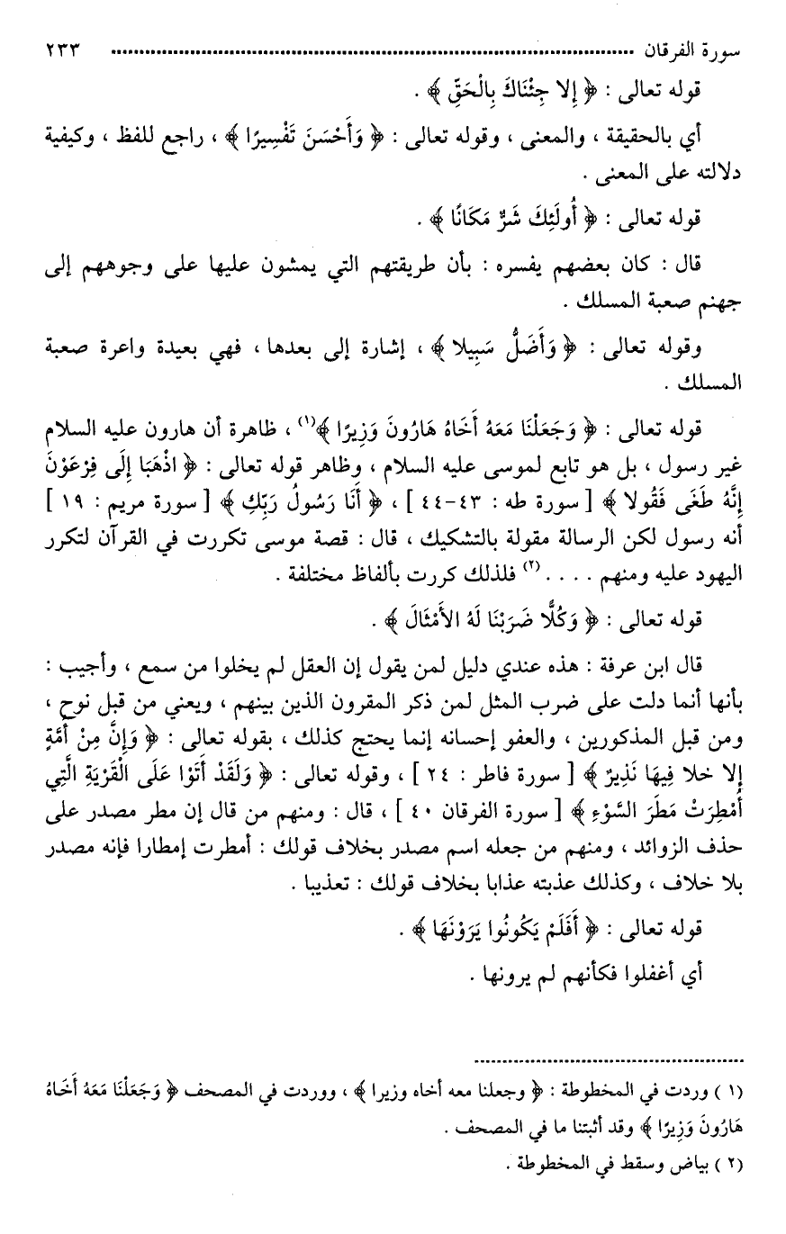 قوله تعالى: {وَجَعَلْنَا مَعَهُ أَخَاهُ هَارُونَ وَزِيرًا (35)} .. ، ظاهره أن هارون عليه السلامِ غير رسول، بل هو تابع لموسى عليه السلام، وظاهر قوله تعالى: [(فَأْتِيَاهُ فَقُولَا إِنَّا رَسُولَا رَبِّكَ)، (فَأْتِيَا فِرْعَوْنَ فَقُولَا إِنَّا رَسُولُ رَبِّ الْعَالَمِينَ) *] أنه رسول لكن الرسالة مقولة بالتشكيك، قال: قصة موسى تكررت في القرآن لتكرر اليهود عليه ومنهم [ ... ] فلذلك كررت بألفاظ مختلفة.