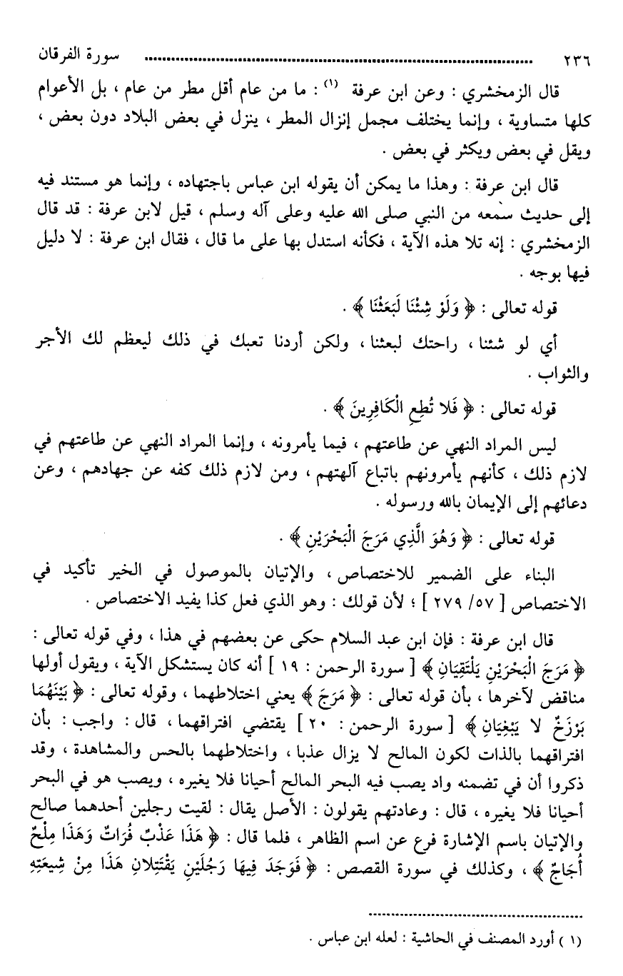 قال ابن عرفة: فإن ابن عبد السلام حكى عن بعضهم في هذا، وفي قوله تعالى: (مَرَجَ الْبَحْرَيْنِ يَلْتَقِيَانِ) أنه كان يستشكل الآية، ويقول أولها مناقض لآخرها، فإن قوله تعالى: (مَرَجَ) يعني اختلاطهما، وقوله تعالى: (بَيْنَهُمَا بَرْزَخٌ لَا يَبْغِيَانِ) يقتضي افتراقهما، قال: [وأجيب*]: بأن افتراقهما بالذات لكون المالح لَا يزال عذبا، واختلاطهما بالحس والمشاهدة، وقد ذكروا أن في تضمنه واد يصب فيه البحر المالح أحيانا فلا يغيره، ويصب هو في البحر أحيانا فلا يغيره، قال: وعادتهم يقولون: الأصل يقال: لقيت رجلين أحدهما صالح والإتيان باسم الإشارة فرع عن اسم الظاهر، فلما قال: (هَذَا عَذْبٌ فُرَاتٌ وَهَذَا مِلْحٌ أُجَاجٌ)، وكذلك في سورة القصص: (فَوَجَدَ فِيهَا رَجُلَيْنِ يَقْتَتِلَانِ هَذَا مِنْ شِيعَتِهِ
