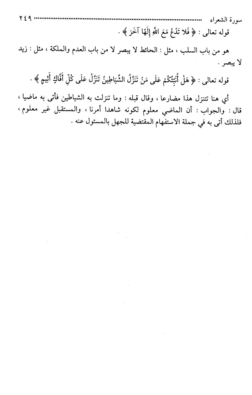 أي هنا (تَنَزَّلُ) هذا مضارعا، وقال قبله، (وَمَا تَنَزَّلَتْ بِهِ الشَّيَاطِينُ) فأتى به ماضيا، قال: والجواب: أن الماضي معلوم لكونه [مشاهدا مرئيا*]، والمستقبل غير معلوم، فلذلك أتى به في جملة الاستفهام المقتضية للجهل بالمسئول عنه.