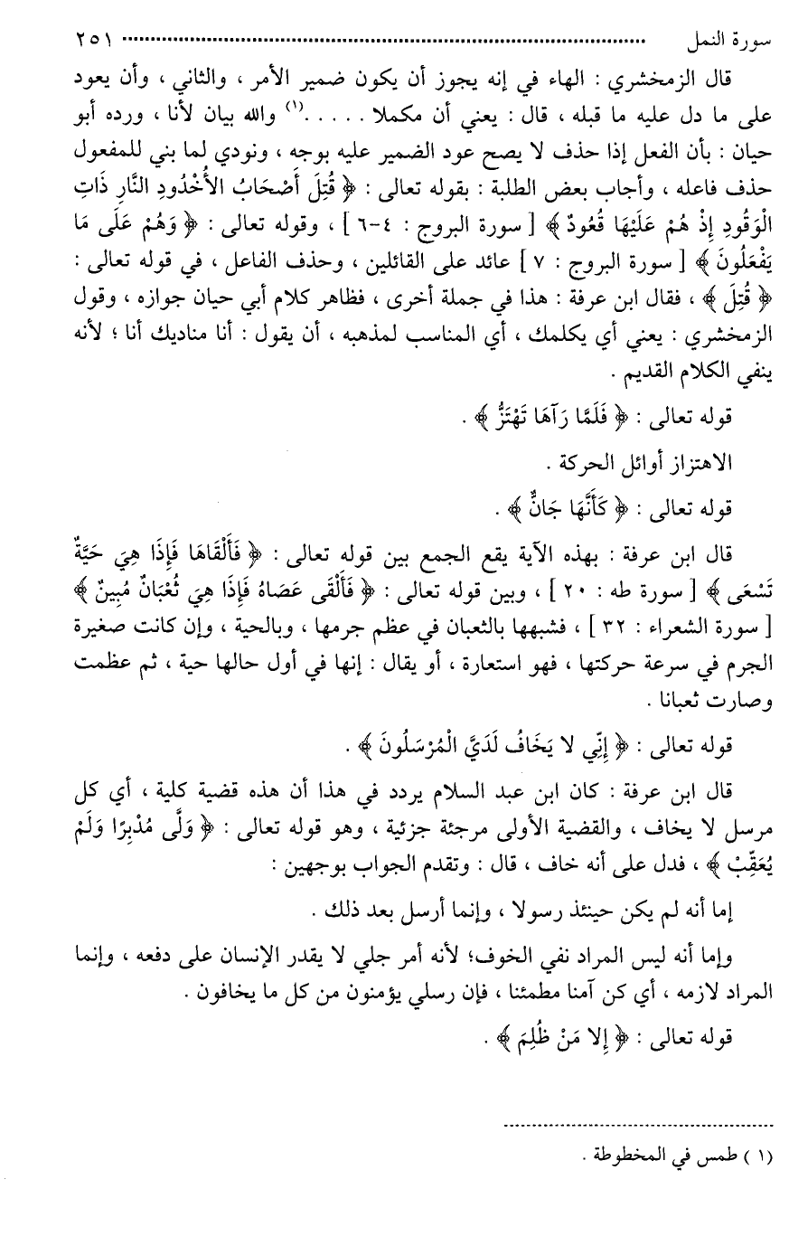 قال ابن عرفة: كان ابن عبد السلام يردد في هذا أن هذه قضية كلية، أي كل مرسل لَا يخاف، والقضية الأولى [موجبة جزئية*]، وهو قوله تعالى: (وَلَّى مُدْبِرًا وَلَمْ يُعَقِّبْ)، فدل على أنه خاف، قال: وتقدم الجواب بوجهين: