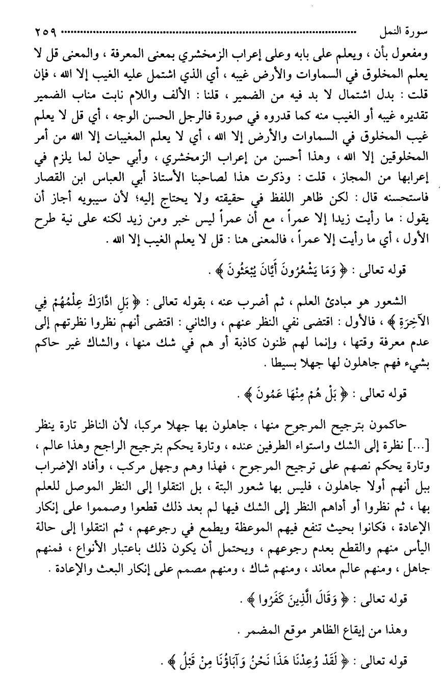 ومفعول بأن، ويعلم على بابه وعلى إعراب الزمخشري بمعنى المعرفة، والمعنى قل لا يعلم المخلوق في السماوات والأرض غيبه، أي الذي اشتمل عليه الغيب إلا الله، فإن قلت: بدل اشتمال لَا بد فيه من الضمير، قلنا: الألف واللام نابت مناب الضمير تقديره غيبه أو الغيب منه كما قدروه في صورة فالرجل الحسن الوجه، أي قل لَا يعلم غيب المخلوق في السماوات والأرض إلا الله، أي لَا يعلم المغيبات إلا الله من أمر المخلوقين إلا الله، وهذا أحسن من إعراب الزمخشري، وأبي حيان لما يلزم في إعرابها من المجاز، قلت: وذكرت هذا لصاحبنا الأستاذ أبي العباس ابن القصار فاستحسنه قال: لكن ظاهر اللفظ في حقيقته ولا يحتاج إليه؛ لأن سيبويه أجاز أن يقول: ما رأيت زيدا إلا عمرا، مع أن عمرا ليس خبر ومن زيد لكنه على نية طرح الأول، أي ما رأيت إلا عمراً، فالمعنى هنا: قل لَا يعلم الغيب إلا الله.