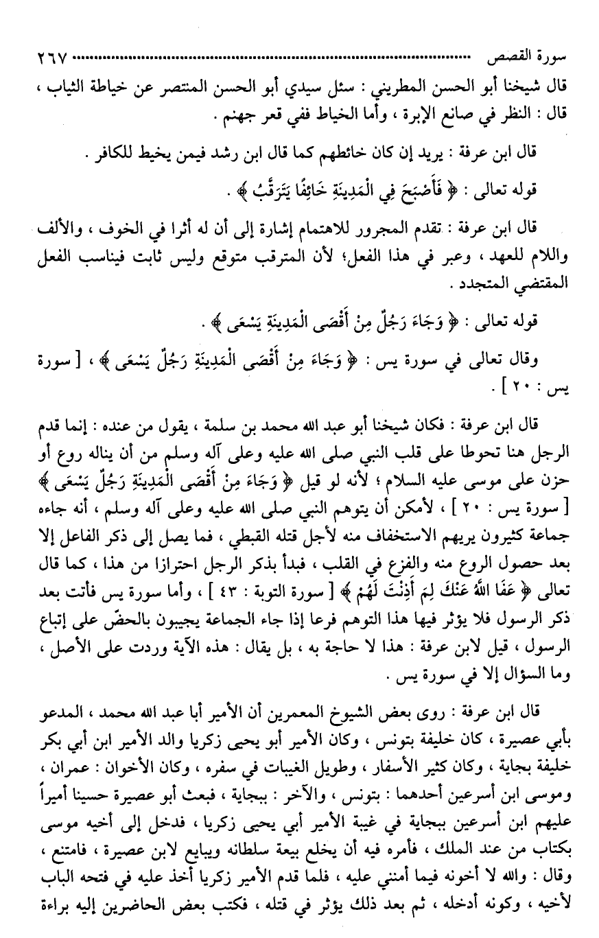 قال ابن عرفة: فكان شيخنا أبو عبد الله محمد بن سلمة، يقول من عنده: إنما قدم الرجل هنا تحوطا على قلب النبي صلى الله عليه وعلى آله وسلم من أن يناله روع أو حزن على موسى عليه السلام؛ لأنه لو قيل (وَجَاءَ مِنْ أَقْصَا الْمَدِينَةِ رَجُلٌ يَسْعَى)، لأمكن أن يتوهم النبي صلى الله عليه وعلى آله وسلم، أنه جاءه جماعة كثيرون يريهم الاستخفاف منه لأجل قتله القبطي، فما يصل إلى ذكر الفاعل إلا بعد حصول الروع منه والفزع في القلب، فبدأ بذكر الرجل احترازا من هذا، كما قال تعالى (عَفَا اللَّهُ عَنْكَ لِمَ أَذِنْتَ لَهُمْ)، وأما سورة يس فأتت بعد ذكر الرسول فلا يؤثر فيها هذا التوهم [فزعا*] إذا جاء الجماعة يجيبون بالحض على إتباع الرسول، قيل لابن عرفة: هذا لَا حاجة به، بل يقال: هذه الآية وردت على الأصل، وما السؤال إلا في سورة يس.