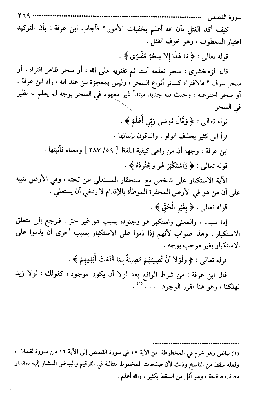 (¬1) بياض، وهو خرم في المخطوطة من الآية 47 في سورة القصص إلى الآية 16 من سورة لقمان، ولعله سقط من النَّاسخ، وذلك لأن صفحات المخطوط متتالية في الترقيم والبياض المشار إليه بمقدار مصف صفحة، وهو أقل من السقط بكثير، والله أعلم.