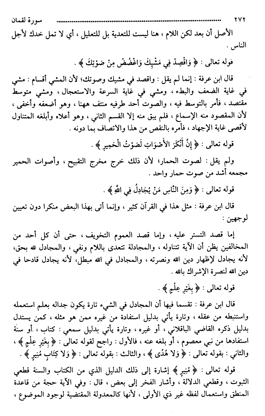 قال ابن عرفة: [يستفاد منها*] أن المجادل في الشيء تارة يكون جداله بعلم استعمله واستنبطه من عقله، وتارة يأتي بدليل استفاده من غيره ممن هو مثله، كمن يستدل بدليل ذكره القاضي الباقلاني، أو غيره، وتارة يأتي بدليل سمعي: كتاب، أو سنة، استفادها من نبي معصوم، أو بلغه عنه، فالأول: راجع لقوله تعالى: (بِغَيْرِ عِلْمٍ)، والثاني: بقوله تعالى: (وَلَا هُدًى)، والثالث: بقوله تعالى: (وَلَا كِتَابٍ مُنِيرٍ).