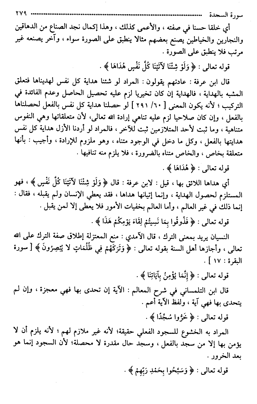 أي هداها اللائق بها، قيل: لابن عرفة: قال (وَلَوْ شِئْنَا لَآتَيْنَا كُلَّ نَفْسٍ)، فهو المستلزم لحصول الهداية، وإنما إتيانها هداها، فقد يعطي الإنسان ولم يقبله، فقال: إنما ذلك في غير العالم، وأما العالم بخفيات الأمور فلا يعطي إلا لمن يقبل.
