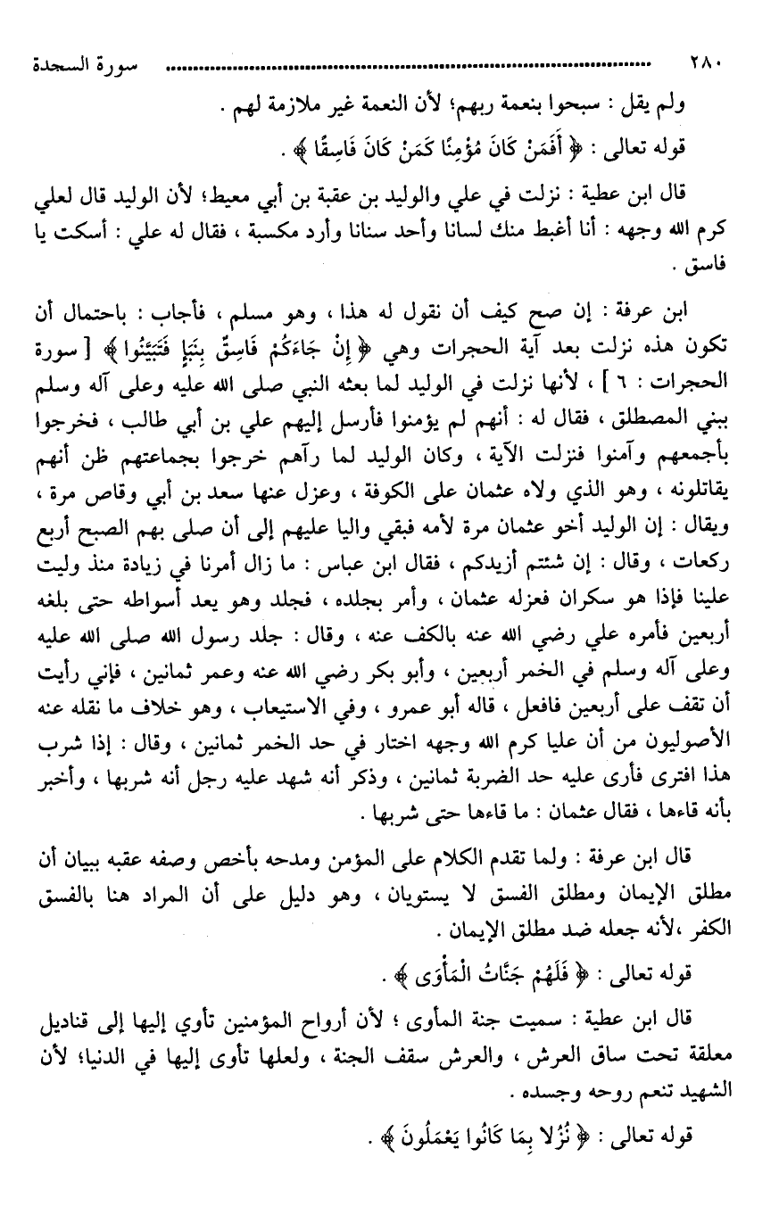 ابن عرفة: إن صح كيف أن نقول له هذا، وهو مسلم، فأجاب: باحتمال أن تكون هذه نزلت بعد آية الحجرات وهي (إِنْ جَاءَكُمْ فَاسِقٌ بِنَبَإٍ فَتَبَيَّنُوا)، لأنها نزلت في الوليد لما بعثه النبي صلى الله عَليه وعلى آله وسلم [إلى بني المصطلق، فقال له: إنهم لم يؤمنوا فأرسل إليهم عليا*] بن أبي طالب، فخرجوا بأجمعهم وآمنوا فنزلت الآية، وكان الوليد لما رآهم خرجوا بجماعتهم ظن أنهم يقاتلونه، وهو الذي ولاه عثمان على الكوفة، وعزل عنها سعد بن أبي وقاص مرة، ويقال: إن الوليد أخو عثمان - رضي الله عنه - لأمه فبقي واليا عليهم إلى أن صلى بهم الصبح أربع ركعات، وقال: إن شئتم أزيدكم، فقال ابن عباس: ما زال أمرنا في زيادة منذ وليت علينا، فإذا هو سكران فعزله عثمان، وأمر بجلده، فجلد وهو يعد أسواطه حتى بلغه أربعين، فأمره علي رضي الله عنه بالكف عنه، وقال: جلد رسول الله صلى الله عليه وعلى آله وسلم في الخمر أربعين، وأبو بكر رضي الله عنه وعمر ثمانين، فإني رأيت أن تقف على أربعين [ففعل*]، قاله أبو عمرو، في الاستيعاب، وهو خلاف ما نقله عنه الأصوليون من أن عليا كرم الله وجهه اختار في حد الخمر ثمانين، وقال: إذا شرب [سكر، وإذا سكر هذى، وإذا هذى افترى*] فأرى عليه [حد الضرب*] ثمانين، وذكر أنه شهد عليه رجل أنه شربها، وأخبر بأنه قاءها، فقال عثمان: ما قاءها حتى شربها.