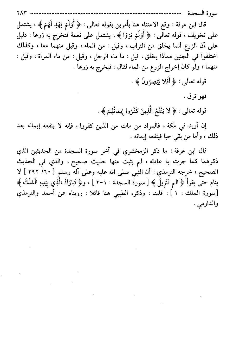 قال ابن عرفة: ما ذكر الزمخشري في آخر سورة السجدة من الحديثين الذي ذكرهما كما جرت به عادته، لم يثبت منها حديث صحيح، والذي في الحديث الصحيح، خرجه الترمذي: أن النبي صلى الله عليه وعلى آله وسلم - كان لا ينام حتى يقرأ (الم تَنْزِيلُ)، و (تَبَارَكَ الَّذِي بِيَدهِ الْمُلْكُ)، قلت: وذكره الطيبي هنا قائلا: رويناه عن أحمد والترمذى والدارمي.