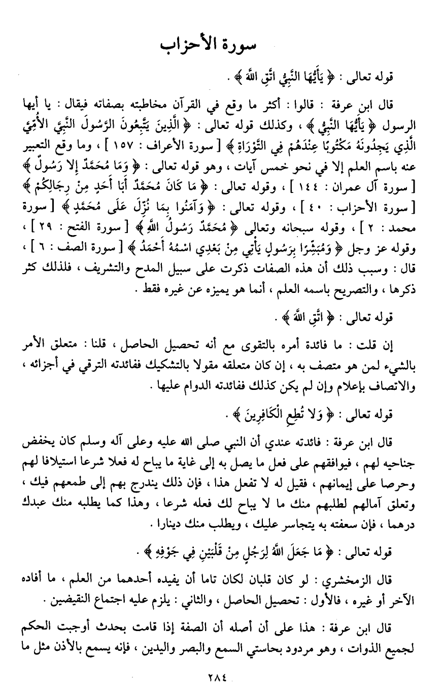 قال ابن عرفة: قالوا: أكثر ما وقع في القرآن مخاطبته بصفاته فيقال: (يَا أَيُّهَا الرَّسُولُ) (يَا أَيُّهَا النَّبِيُّ)، وكذلك قوله تعالى: (الَّذِينَ يَتَّبِعُونَ الرَّسُولَ النَّبِيَّ الْأُمِّيَّ الَّذِي يَجِدُونَهُ مَكْتُوبًا عِنْدَهُمْ فِي التَّوْرَاةِ)، وما وقع التعبير عنه باسم العلم إلا في نحو خمس آيات، وهو قوله تعالى: (وَمَا مُحَمَّدٌ إِلَّا رَسُولٌ)، وقوله تعالى: (مَا كَانَ مُحَمَّدٌ أَبَا أَحَدٍ مِنْ رِجَالِكُمْ)، وقوله تعالى: (وَآمَنُوا بِمَا نُزِّلَ عَلَى مُحَمَّدٍ)، وقوله سبحانه وتعالى (مُحَمَّدٌ رَسُولُ اللَّهِ)، وقوله عز وجل (وَمُبَشِّرًا بِرَسُولٍ يَأْتِي مِنْ بَعْدِي اسْمُهُ أَحْمَدُ)، قال: وسبب ذلك أن هذه الصفات ذكرت على سبيل المدح والتشريف، فلذلك كثر ذكرها، والتصريح باسمه العلم إنما هو يميزه عن غيره فقط.