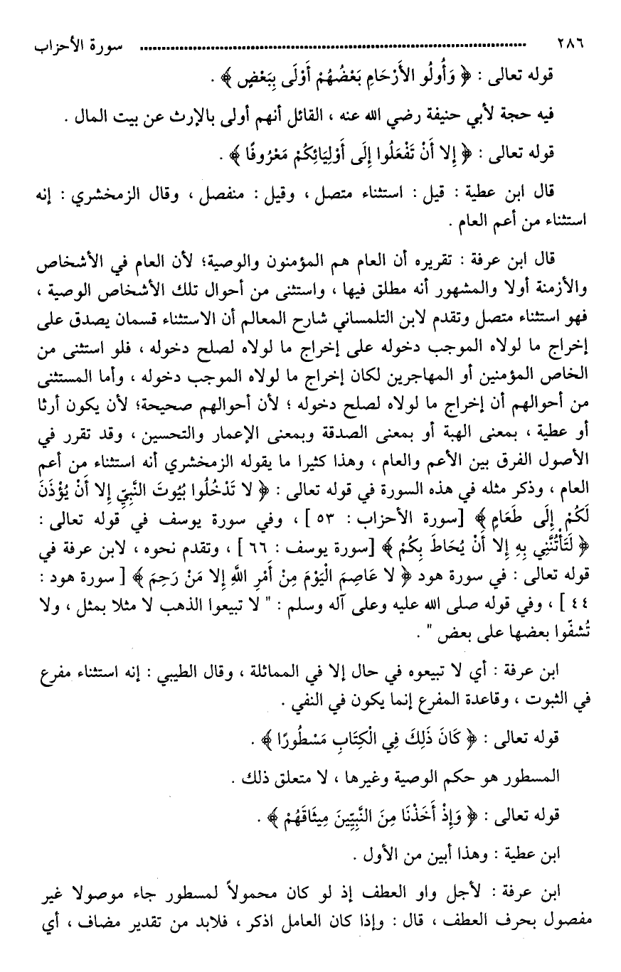 قال ابن عرفة: تقريره أن العام هم المؤمنون والوصية؛ لأن العام في الأشخاص والأزمنة أولا، والمشهور أنه مطلق فيها، واستثنى من أحوال تلك الأشخاص الوصية، فهو استثناء متصل، وتقدم لابن التلمساني شارح المعالم أن الاستثناء قسمان يصدق على إخراج ما لولاه الموجب دخوله على إخراج ما لولاه لصلح دخوله، فلو استثنى من الخاص المؤمنين أو المهاجرين لكان إخراج ما لولاه الموجب دخوله، وأما المستثنى من أحوالهم أن إخراج ما لولاه لصلح دخوله؛ لأن أحوالهم صحيحة؛ لأن يكون إرثا أو عطية، بمعنى الهبة أو بمعنى الصدقة وبمعنى الإعمار والتحسين، وقد تقرر في الأصول الفرق بين الأعم والعام، وهذا كثيرا ما يقوله الزمخشري أنه استثناء من أعم العام، وذكر مثله في هذه السورة في قوله تعالى: (لَا تَدْخُلُوا بُيُوتَ النَّبِيِّ إِلَّا أَنْ يُؤْذَنَ لَكُمْ إِلَى طَعَامٍ)، وفي سورة يوسف في قوله تعالى: (لَتَأْتُنَّنِي بِهِ إِلَّا أَنْ يُحَاطَ بِكُمْ)، وتقدم نحوه، لابن عرفة في قوله تعالىَ: في سورة هود (لَا عَاصِمَ الْيَوْمَ مِنْ أَمْرِ اللَّهِ إِلَّا مَنْ رَحِمَ)، وفي قوله صلى الله عليه وعلى آله وسلم: " [لاَ تَبِيعُوا الذَّهَبَ بِالذَّهَبِ إِلَّا مِثْلًا بِمِثْلٍ، وَلاَ تُشِفُّوا بَعْضَهَا عَلَى بَعْضٍ*] ".