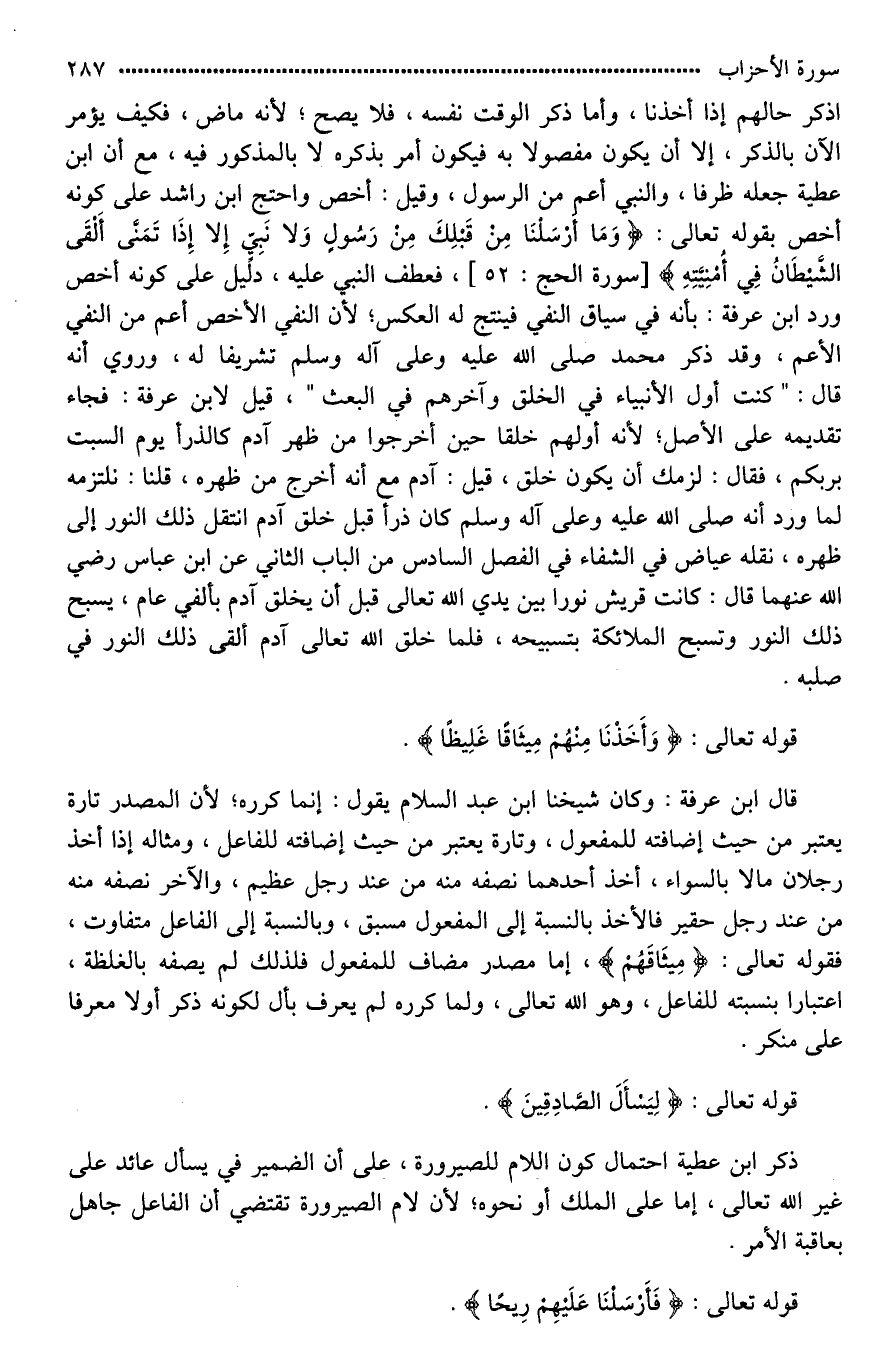 اذكر حالهم إذا أخذنا، وأما ذكر الوقت نفسه، فلا يصح؛ لأنه ماض، فكيف يؤمر الآن بالذكر، إلا أن يكون مفصولا به فيكون أمر بذكره لَا بالمذكور فيه، مع أن ابن عطية جعله ظرفا، والنبي أعم من الرسول، وقيل: أخص واحتج ابن [رشد*] على كونه أخص بقوله تعالى: (وَمَا أَرْسَلْنَا مِنْ قَبْلِكَ مِنْ رَسُولٍ وَلَا نَبِيٍّ إِلَّا إِذَا تَمَنَّى أَلْقَى الشَّيْطَانُ فِي أُمْنِيَّتِهِ)، فعطف النبي عليه، دليل على كونه أخص ورد ابن عرفة: بأنه في سياق النفي فينتج له العكس؛ لأن النفي الأخص أعم من النفي الأعم، وقد ذكر محمد صلى الله عليه وعلى آله وسلم تشريفا له، وروي أنه قال: "كنت أول الأنبياء في الخلق وآخرهم في البعث"، قيل لابن عرفة: فجاء تقديمه على الأصل؛ لأنه أولهم خلقا حين أخرجوا من ظهر آدم [كالذر يوم (أَلَسْتُ بِرَبِّكُمْ) *]، فقال: لزمك أن يكون خلق، قيل: آدم مع أنه أخرج من ظهره، قلنا: نلتزمه لما ورد أنه صلى الله عليه وعلى آله وسلم كان ذرا قبل خلق آدم انتقل ذلك النور إلى ظهره، نقله عياض في الشفاء في الفصل السادس من الباب الثاني عن ابن عباس رضي الله عنهما قال: [كَانَتْ قُرَيْشٌ نُورًا بَيْنَ يَدَيِ اللَّهِ عَزَّ وَجَلَّ قَبْلَ أَنْ يَخْلُقَ آدَمَ بِأَلْفَيْ عَامٍ يُسَبِّحُ ذَلِكَ النُّورُ وَتُسَبِّحُ الْمَلَائِكَةُ بِتَسْبِيحِهِ, فَلَمَّا خَلَقَ اللَّهُ عَزَّ وَجَلَّ آدَمَ أَلْقَى ذَلِكَ النُّورَ فِي صُلْبِهِ*].