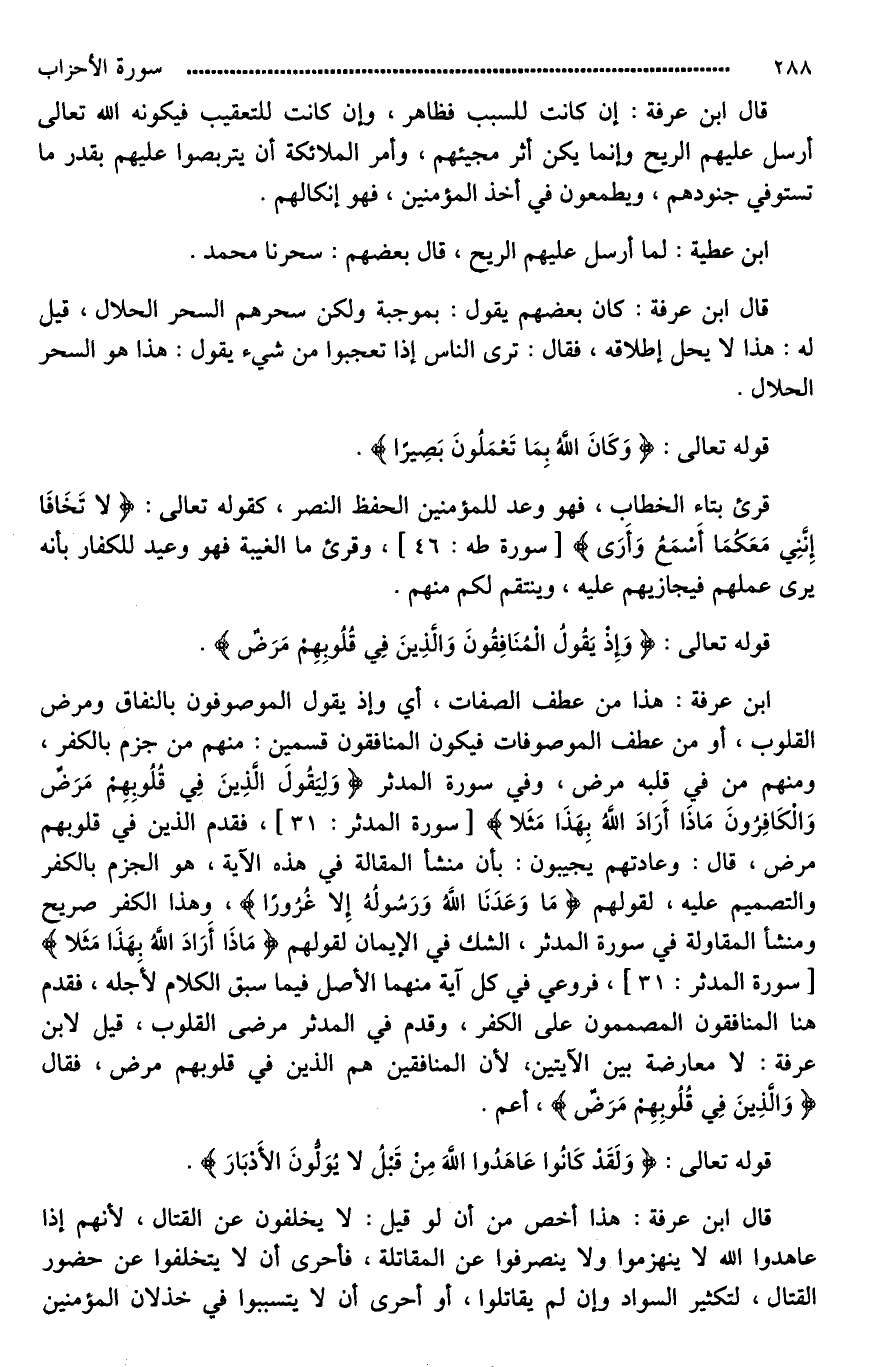 ابن عرفة: هذا من عطف الصفات، أي وإذ يقول الموصوفون بالنفاق ومرض القلوب، أو من عطف الموصوفات فيكون المنافقون قسمين: منهم من جزم بالكفر، ومنهم من في قلبه مرض، وفي سورة المدثر (وَلِيَقُولَ الَّذِينَ فِي قُلُوبِهِمْ مَرَضٌ وَالْكَافِرُونَ مَاذَا أَرَادَ اللَّهُ بِهَذَا مَثَلًا)، فقدم الذين في قلوبهم مرض، قال: وعادتهم يجيبون: بأن منشأ المقالة في هذه الآية، هو الجزم بالكفر والتصميم عليه، لقولهم (مَا وَعَدَنَا اللَّهُ وَرَسُولُهُ إِلَّا غُرُورًا)، وهذا الكفر صريح ومنشأ [المقالة*] في سورة المدثر، الشك في الإيمان لقولهم (مَاذَا أَرَادَ اللَّهُ بِهَذَا مَثَلًا)، فروعي في كل آية منهما الأصل فيما سبق الكلام لأَجله، فقدم هنا المنافقون المصممون على الكفر، وقدم في المدثر مرضى القلوب، قيل لابن عرفة: لَا معارضة بين الآيتين، لأن المنافقين هم الذين في قلوبهم مرض، فقال (وَالَّذِينَ فِي قُلُوبِهِم مَرَضٌ)، أعم.