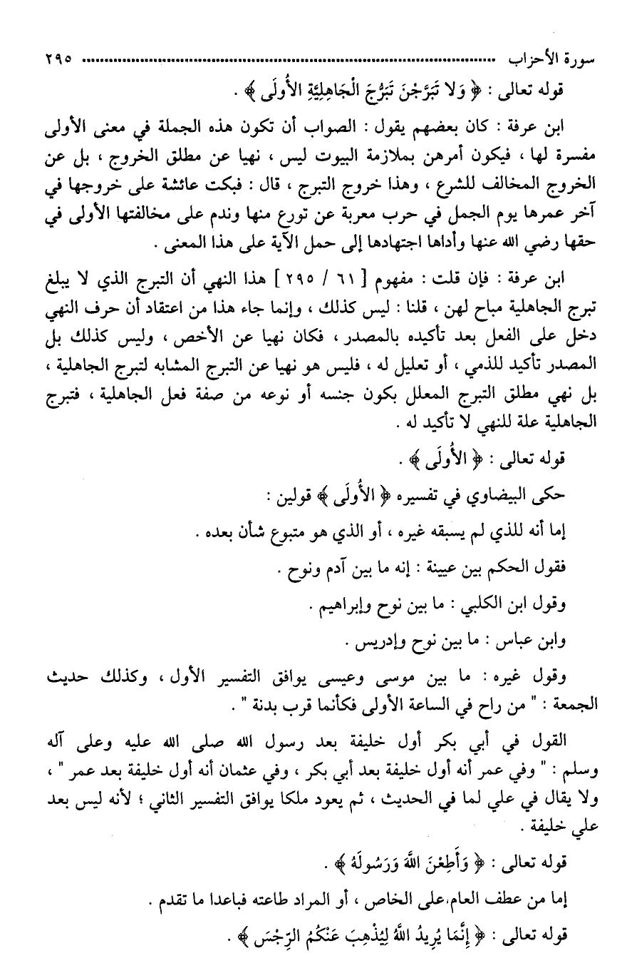 ابن عرفة: كان بعضهم يقول: الصواب أن تكون هذه الجملة في معنى الأولى مفسرة لها، فيكون أمرهن بملازمة البيوت ليس نهيا عن مطلق الخروج، بل عن الخروج المخالف للشرع، وهذا خروج التبرج، قال: فبكت عائشة على خروجها في آخر عمرها يوم الجمل في حرب معربة عن تورع منها وندم على مخالفتها الأولى في حقها رضي الله عنها وأداها اجتهادها إلى حمل الآية على هذا المعنى.