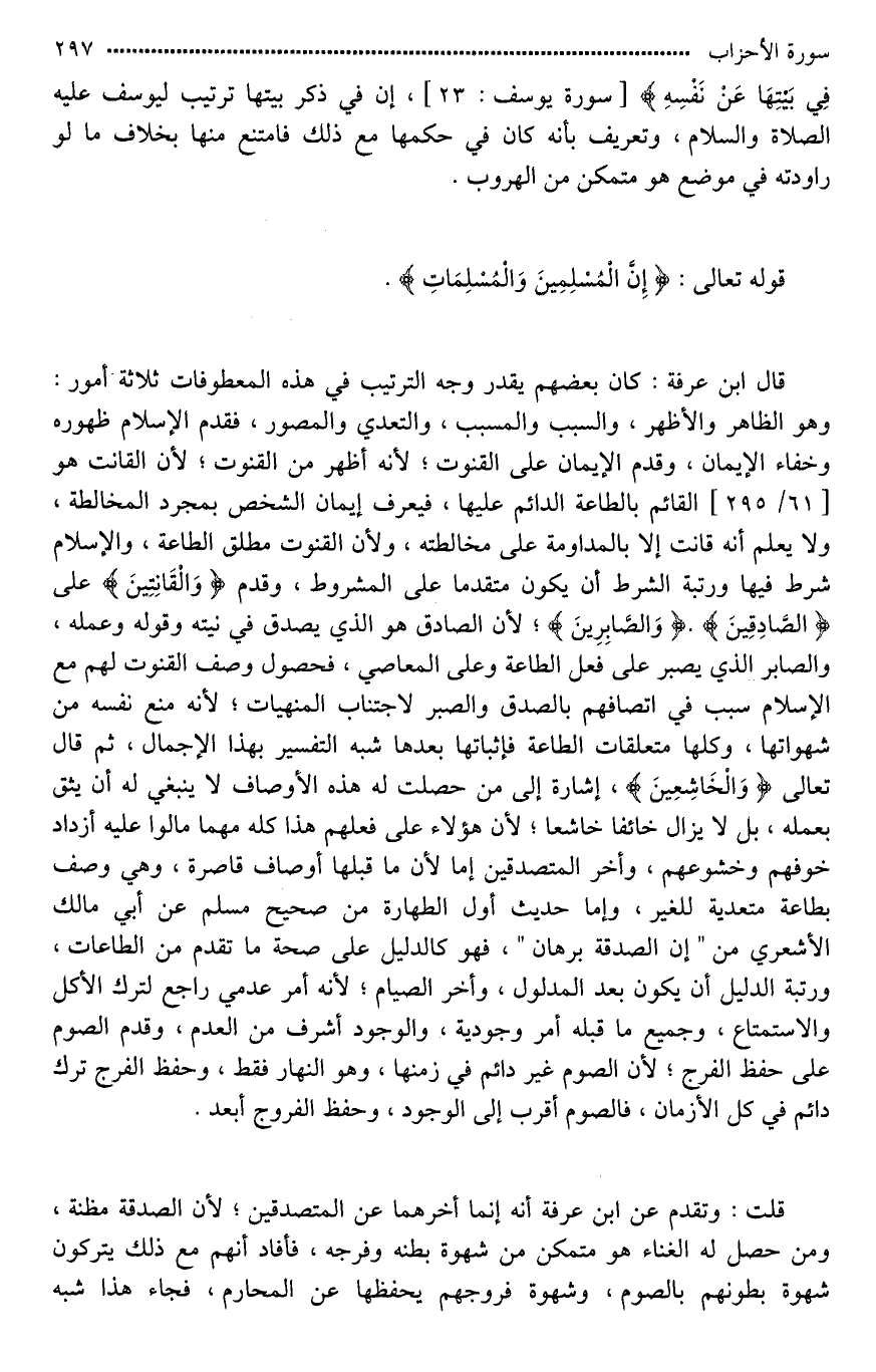 قال ابن عرفة: كان بعضهم يقدر وجه الترتيب في هذه المعطوفات ثلاثة أمور: وهو الظاهر والأظهر، والسبب والمسبب، [والتصديق والتصور*]، فقدم الإسلام ظهوره وخفاء الإيمان، وقدم الإيمان على القنوت؛ لأنه أظهر من القنوت؛ لأن القانت هو القائم بالطاعة الدائم عليها، فيعرف إيمان الشخص بمجرد المخالطة، ولا يعلم أنه قانت إلا بالمداومة على مخالطته، ولأن القنوت مطلق الطاعة، والإسلام شرط فيها، ورتبة الشرط أن يكون متقدما على المشروط، وقدم (وَالْقَانِتِينَ) على (الصَّادِقِينَ). (وَالصَّابِرِينَ)؛ لأن الصادق هو الذي يصدق في نيته وقوله وعمله، والصابر الذي يصبر على فعل الطاعة وعلى المعاصي، فحصول وصف القنوت لهم مع الإسلام سبب في اتصافهم بالصدق والصبر لاجتناب المنهيات؛ لأنه منع نفسه من شهواتها، وكلها متعلقات الطاعة فإثباتها بعدها شبه التفسير بهذا الإجمال، ثم قال تعالى (وَالْخَاشِعِينَ)، إشارة إلى من حصلت له هذه الأوصاف لَا ينبغي له أن يثق بعمله، بل لَا يزال خائفا خاشعا؛ لأن هؤلاء على فعلهم هذا كله مهما مالوا عليه ازداد خوفهم وخشوعهم، وأخّر المتصدقين إما لأن ما قبلها أوصاف قاصرة، وهي وصف بطاعة متعدية للغير، وإما حديث أول الطهارة من صحيح مسلم عن أبي مَالِكٍ الْأَشْعَرِيِّ من ["وَالصَّدَقَةُ بُرْهَانٌ"*]، فهو كالدليل على صحة ما تقدم من الطاعات، ورتبة الدليل أن يكون بعد المدلول، وأخر الصيام؛ لأنه أمر عدمي راجع لترك الأكل والاستمتاع، وجميع ما قبله أمر وجودية، والوجود أشرف من العدم، وقدم الصوم على حفظ الفرج؛ لأن الصوم غير دائم في زمنها، وهو النهار فقط، وحفظ الفرج ترك دائم في كل الأزمان، فالصوم أقرب إلى الوجود، وحفظ الفروج أبعد.