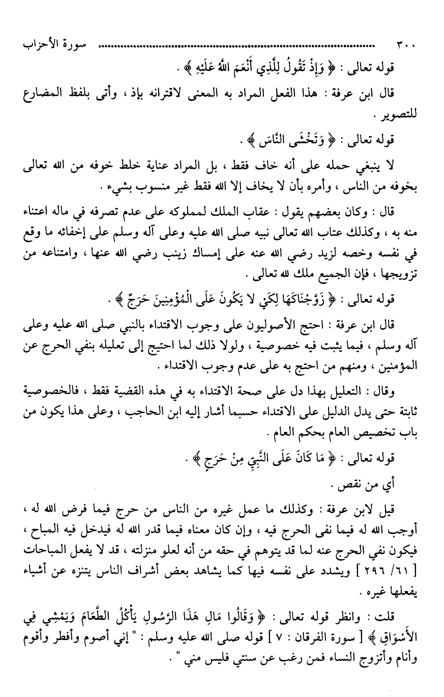 قال ابن عرفة: احتج الأصوليون على وجوب الاقتداء بالنبي صلى الله عليه وعلى آله وسلم، فيما يثبت فيه خصوصية، ولولا ذلك لما احتيج إلى تعليله بنفي الحرج عن المؤمنين، ومنهم من احتج به على عدم وجوب الاقتداء.