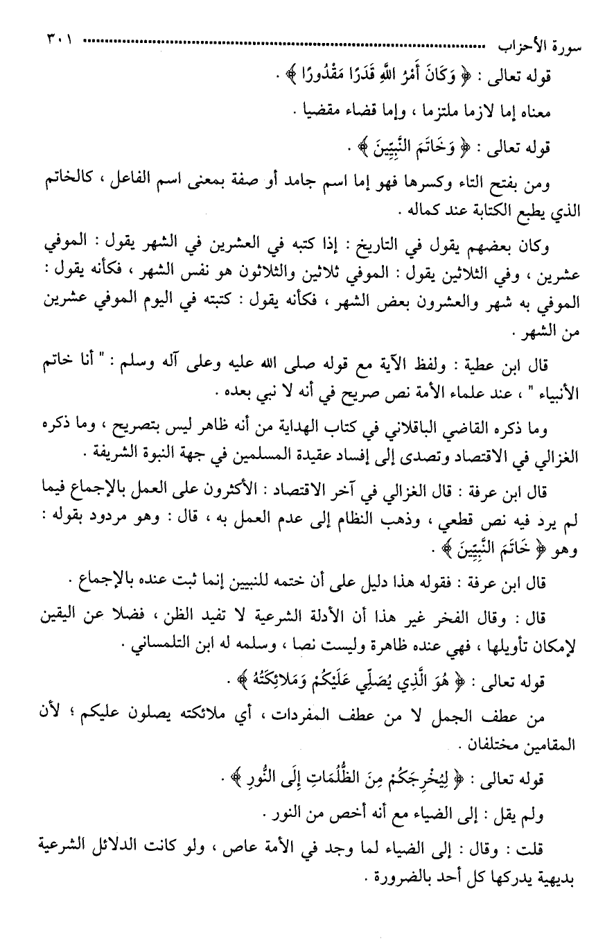 قال ابن عطية: ولفظ الآية مع قوله صلى الله عليه وعلى آله وسلم: "أنا خاتم الأنبياء"، عند علماء الأمة نص صريح في أنه لَا نبي بعده.