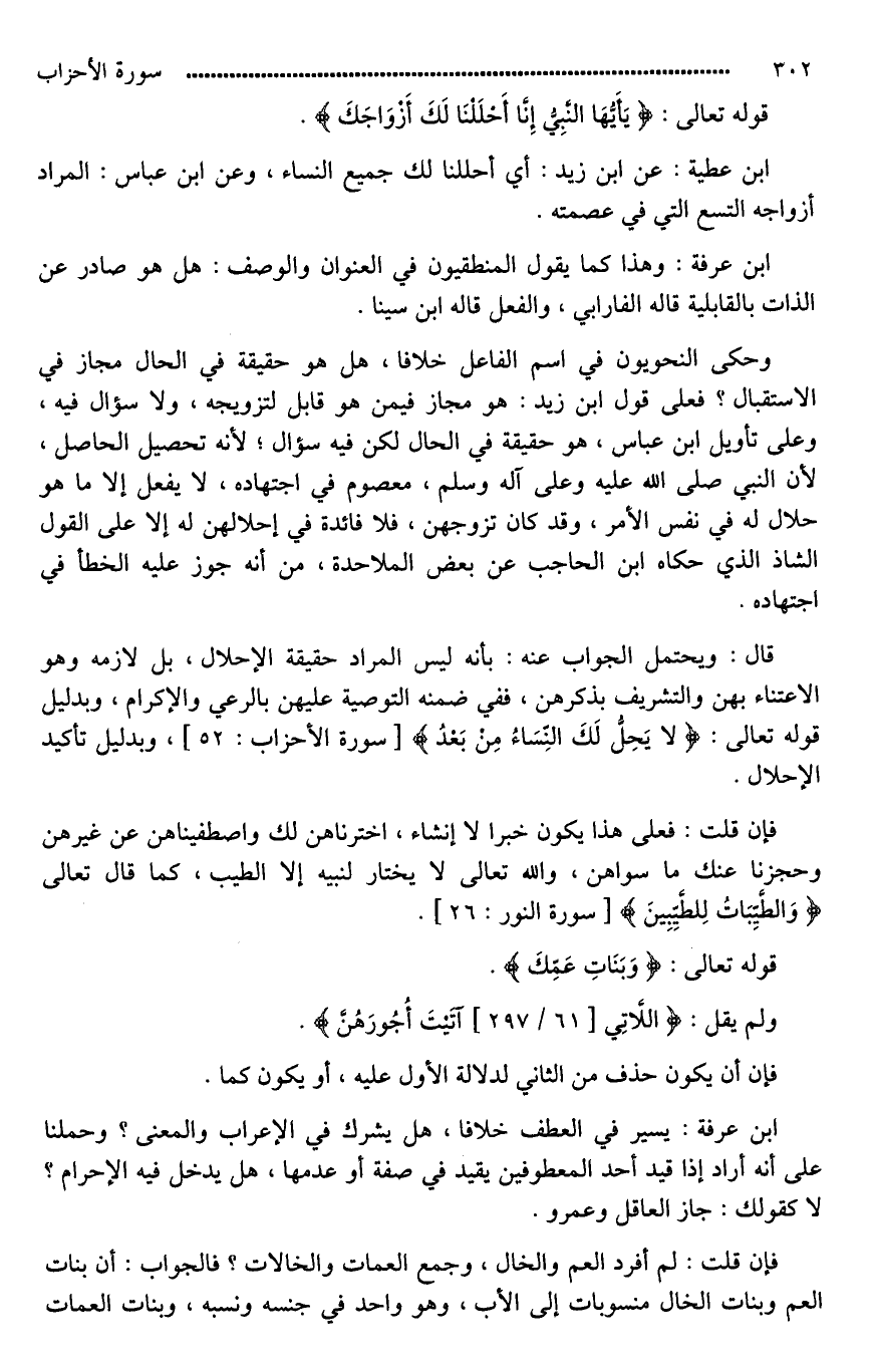 وحكى النحويون في اسم الفاعل خلافا، هل هو حقيقة في الحال مجاز في الاستقبال؟ فعلى قول ابن زيد: هو مجاز فيمن هو قابل لتزويجه، ولا سؤال فيه، وعلى تأويل ابن عباس، هو حقيقة في الحال لكن فيه سؤال؛ لأنه تحصيل الحاصل، لأن النبي صلى الله عليه وعلى آله وسلم، معصوم في اجتهاده، لَا يفعل إلا ما هو حلال له في نفس الأمر، وقد كان تزوجهن، فلا فائدة في إحلالهن له إلا على القول الثاني الذي حكاه ابن الحاجب عن بعض الملاحدة، من أنه جوز عليه الخطأ في اجتهاده.