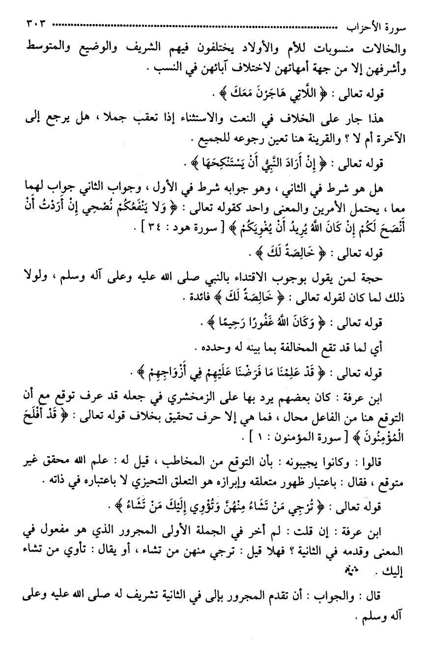 ابن عرفة: إن قلت: لم أخر في الجملة الأولى المجرور الذي هو مفعول في المعنى وقدمه في الثانية؟ فهلا قيل: ترجي منهن من تشاء، أو يقال: تؤوي من تشاء إليك.