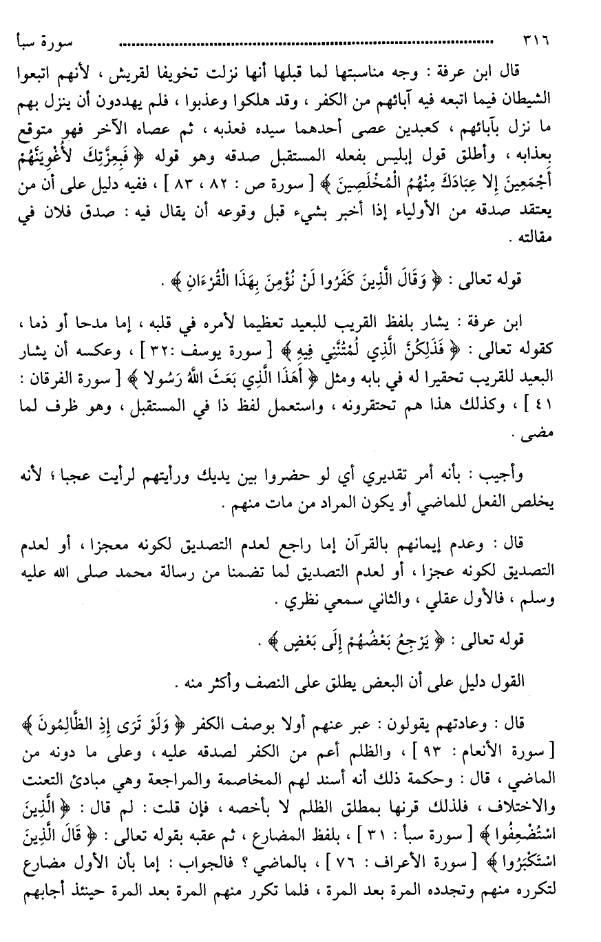 قال ابن عرفة: وجه مناسبتها لما قبلها أنها نزلت تخويفا لقريش، لأنهم اتبعوا الشيطان فيما اتبعه فيه [آباؤهم*] من الكفر، وقد هلكوا وعذبوا، [فلم [يتوقعوا*] أن ينزل بهم ما نزل بآبائهم، كعبدين عصى أحدهما سيده فعذبه، ثم عصاه الآخر فهو متوقع [عذابه*]، وأطلق قول إبليس بفعله المستقبل صدقه وهو قوله (فَبِعِزَّتِكَ لَأُغْوِيَنَّهُمْ أَجْمَعِينَ (82) إِلَّا عِبَادَكَ مِنْهُمُ الْمُخْلَصِينَ)، ففيه دليل على أن من يعتقد صدقه من الأولياء إذا أخبر بشيء قبل وقوعه أن يقال فيه: صدق فلان في مقالته.