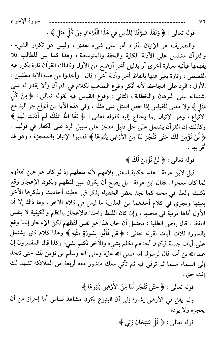 قيل لابن عرفة؛ هذه حكاية لمعنى [كلامهم*]؛ لأنه [بفعلهم*] إذ لو كان هو عين لفظهم لما كان معجزا، فقال ابن عرفة: بل يصح أن يكون عين لفظهم ويكون الإعجاز وقع تكليفه ولعله في محله كما نجد بعض الخطباء يذكر في خطبته أحاديث ويذكرها الآخر بعينها ويجري في كلام أحدهما من العذوبة ما ليس في كلام الآخر، وما ذاك إلا أن الأول أتاها مرتبة في محلها، وإن كان اللفظ واحدا، فالإعجاز بالنظم والكيفية لَا بنفس اللفظ. قال بعض الطلبة: يحتمل أن حال هذا هو نفس لفظهم لكن الإعجاز إنما وقع بالسورة ثلاث آيات لقوله تعالى: (قُلْ فَأْتُوا بِسُورَةٍ مِثْلِهِ) وهذا كلام كثير يشتمل على آيات جملة فيكون أحدهم تكلم بشيء والآخر تكلم بشيء، وكذا قال المفسرون إن عبد الله بن أمية قال لرسول الله صلى الله عليه وعلى آله وسلم لن نؤمن لك حتى تتخذ إلى السماء سلما ثم ترقى فيه ثم تأتي معك منشور معه أربعة من الملائكة تشهد لك إنك حق.
