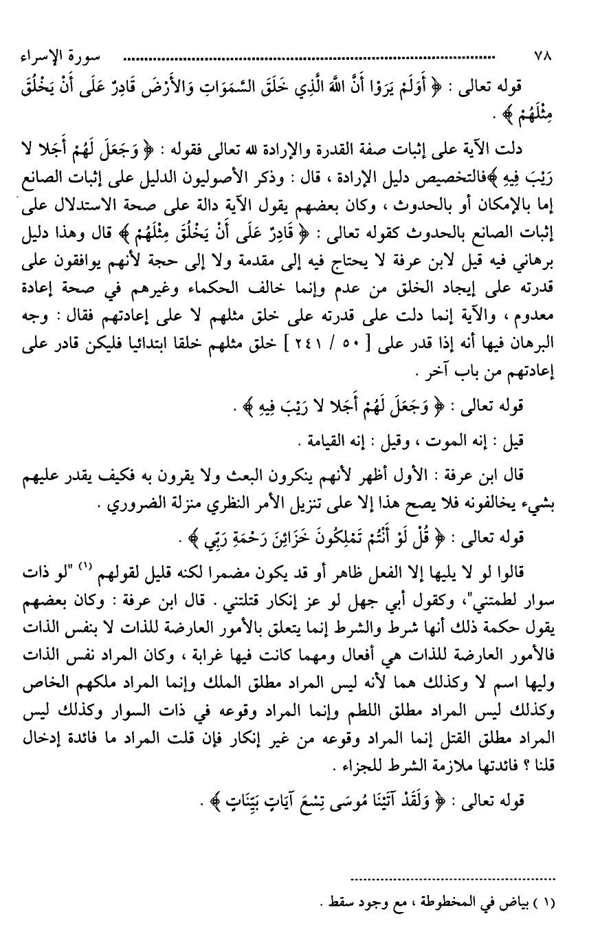 دلت الآية على إثبات صفة القدرة والإرادة لله تعالى فقوله: (وَجَعَلَ لَهُمْ أَجَلا لَا رَيْبَ فِيهِ) فالتخصيص دليل الإرادة، قال: وذكر الأصوليون الدليل على إثبات الصانع إما بالإمكان أو بالحدوث، وكان بعضهم يقول الآية دالة على صحة الاستدلال على إثبات الصانع بالحدوث كقوله تعالى: (قَادِرٌ عَلَى أَنْ يَخْلُقَ مِثْلَهُم) قال وهذا دليل برهاني فيه قيل لابن عرفة لَا يحتاج فيه إلى مقدمة ولا إلى حجة لأنهم يوافقون على قدرته على إيجاد الخلق من عدم، وإنَّمَا خالف الحكماء وغيرهم في صحة إعادة معدوم، والآية إنما دلت على قدرته على خلق مثلهم لَا على إعادتهم فقال: وجه البرهان فيها أنه إذا قدر على خلق مثلهم خلقا ابتدائيا فليكن قادر على إعادتهم من باب [أحرى*].