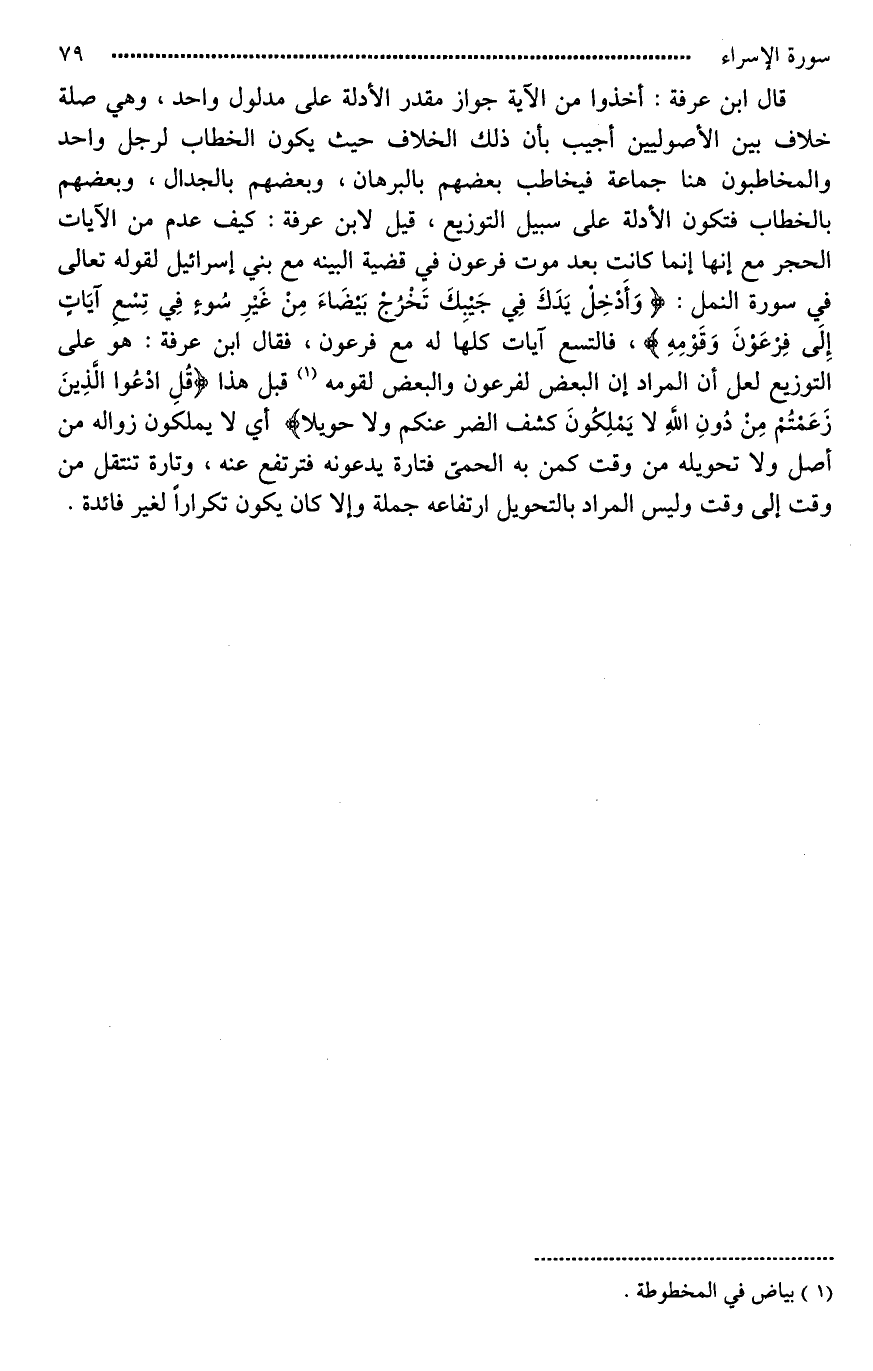 قال ابن عرفة: أخذوا من الآية جواز [توارد*] الأدلة على مدلول واحد، وهي صلة خلاف بين الأصوليين، أجيب بأن ذلك الخلاف حيث يكون الخطاب لرجل واحد، والمخاطبون هنا جماعة فيخاطب بعضهم بالبرهان، وبعضهم بالجدال، وبعضهم بالخطاب، فتكون الأدلة على سبيل التوزيع، قيل لابن عرفة: كيف عدم من الآيات الحجر مع إنها إنما كانت بعد موت فرعون في قضية البينة مع بني إسرائيل لقوله تعالى في سورة النمل: (وَأَدْخِلْ يَدَكَ فِي جَيْبِكَ تَخْرُجْ بَيْضَاءَ مِنْ غَيْرِ سُوءٍ فِي تِسْعِ آيَاتٍ إِلَى فِرْعَوْنَ وَقَوْمِهِ)، فالتسع آيات كلها له مع فرعون، فقال ابن عرفة: هو على التوزيع لعل أن المراد إن البعض لفرعون والبعض لقومه قبل هذا (قُلِ ادْعُوا الَّذِينَ زَعَمْتُمْ مِنْ دُونِهِ فَلَا يَمْلِكُونَ كَشْفَ الضُّرِّ عَنْكُمْ وَلَا تَحْوِيلًا) أي لَا يملكون زواله من أصل ولا تحويله من وقت كمن به الحمى، فتارة يدعونه فترتفع عنه، وتارة تنتقل من وقت إلى وقت، وليس المراد بالتحويل ارتفاعه جملة، وإلا كان يكون تكرارا لغير فائدة.