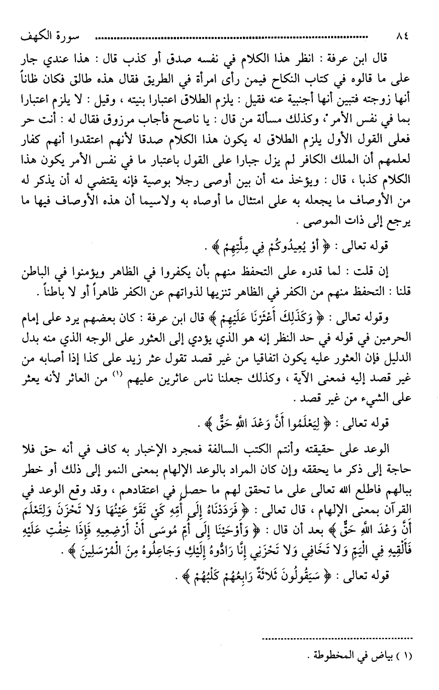 وقوله تعالى: (وَكَذَلِكَ أَعْثَرْنَا عَلَيْهِمْ ... (21) .. قال ابن عرفة: كان بعضهم يرد على إمام الحرمين في قوله في حد النظر إنه هو الذي يؤدي إلى العثور على الوجه الذي منه [يدل*] الدليل فإن العثور عليه يكون اتفاقيا من غير قصد تقول عثر زيد على كذا إذا أصابه من غير قصد إليه فمعنى الآية، وكذلك جعلنا ناس عاثرين عليهم من العاثر لأنه يعثر على الشيء من غير قصد.