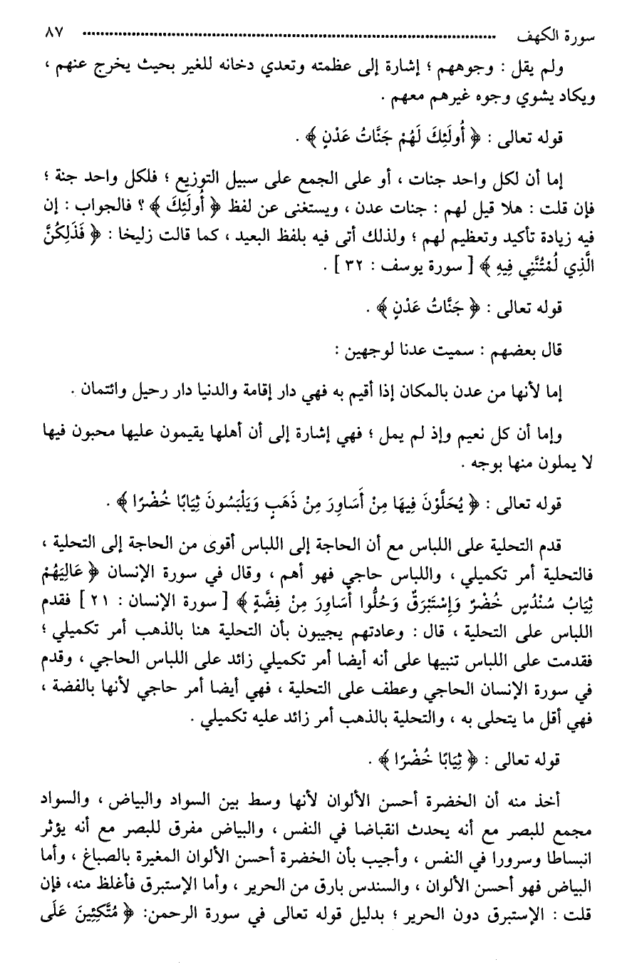 قدم التحلية على اللباس مع أن الحاجة إلى اللباس أقوى من الحاجة إلى التحلية، فالتحلية أمر تكميلي، واللباس حاجي فهو أهم، وقال في سورة الإنسان (عَالِيَهُمْ ثِيَابُ سُنْدُسٍ خُضْرٌ وَإِسْتَبْرَقٌ وَحُلُّوا أَسَاوِرَ مِنْ فِضَّةٍ) فقدم اللباس على التحلية، قال: وعادتهم يجيبون بأن التحلية هنا بالذهب أمر تكميلي، فقدمت على اللباس تنبيها على أنه أيضا أمر تكميلي زائد على اللباس الحاجي، وقدم في سورة الإنسان الحاجي وعطف على التحلية، فهي أيضا أمر حاجي لأنها بالفضة، فهي أقل ما يتحلى به، والتحلية بالذهب أمر زائد عليه تكميلي.