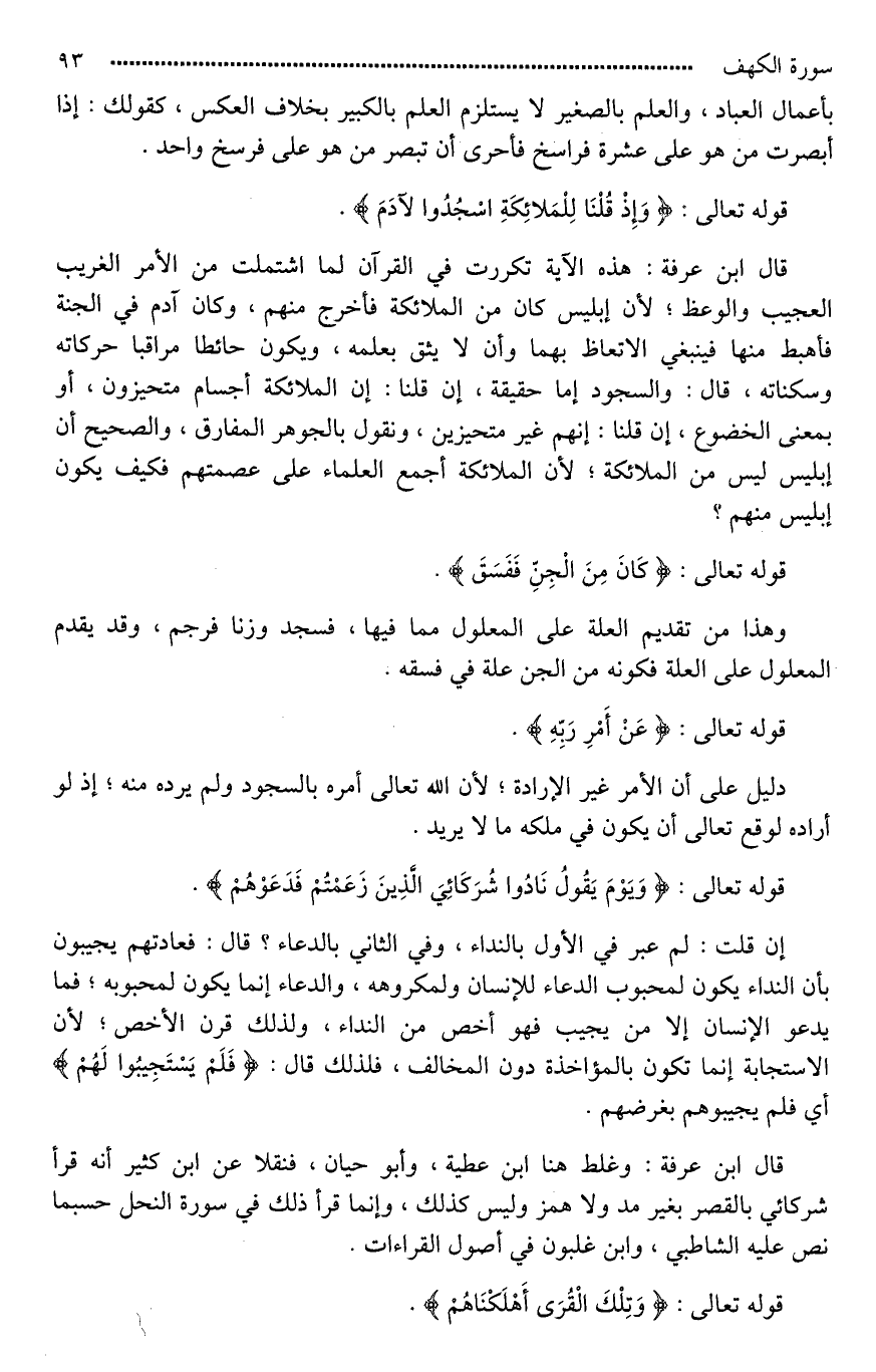 قال ابن عرفة: هذه الآية تكررت في القرآن لما اشتملت من الأمر الغريب العجيب والوعظ؛ لأن إبليس كان من الملائكة فأُخرج منهم، وكان آدم في الجنة فأُهبط منها فينبغي الاتعاظ بهما وأن لَا يثق بعلمه، ويكون حائطا مراقبا حركاته وسكناته، قال: والسجود إما حقيقة، إن قلنا: إن الملائكة أجسام متحيزون، أو بمعنى الخضوع، إن قلنا: إنهم غير متحيزين، ونقول بالجوهر المفارق، والصحيح أن إبليس ليس من الملائكة؛ لأن الملائكة أجمع العلماء على عصمتهم فكيف يكون إبليس منهم؟
