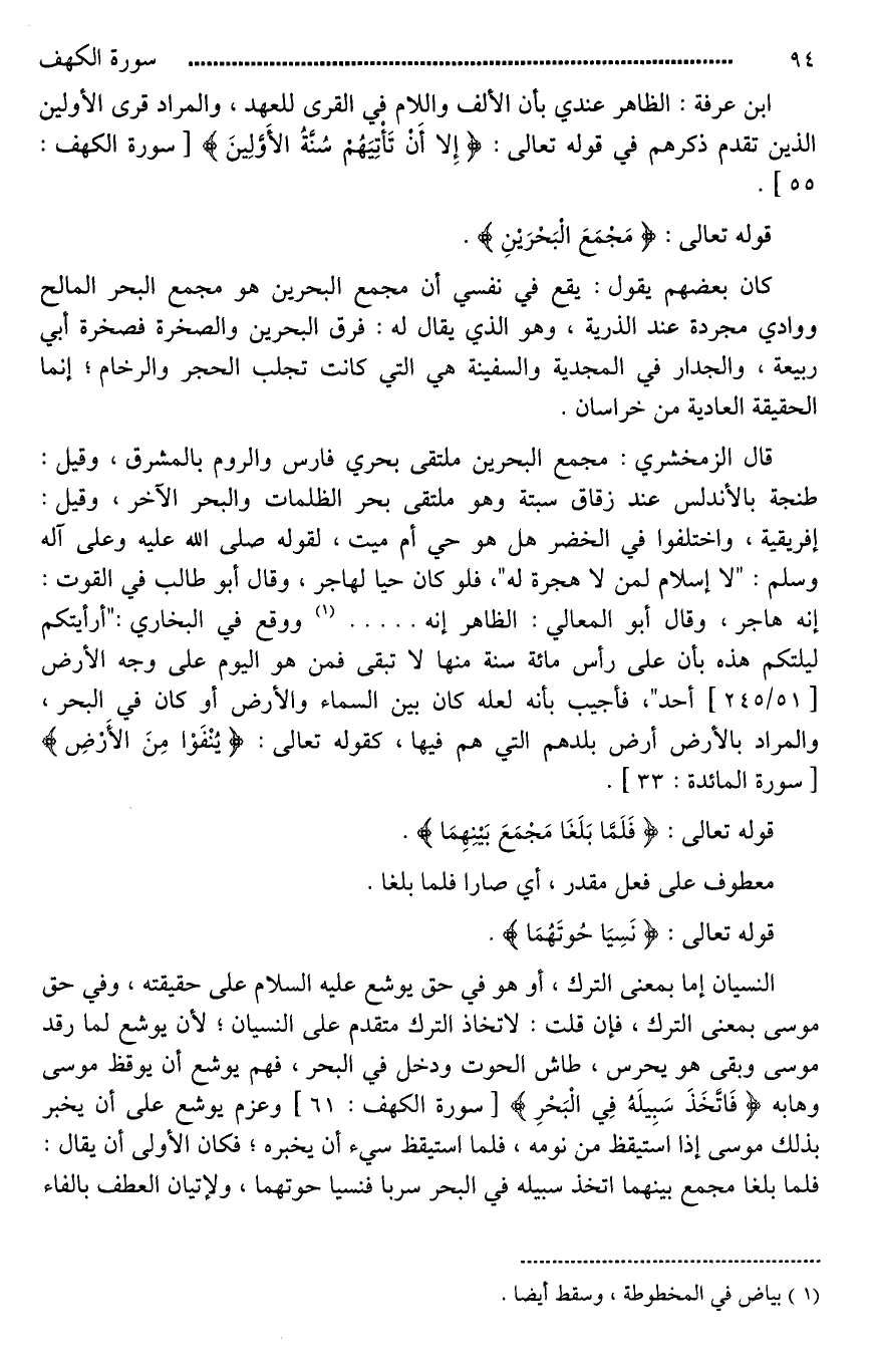 قال الزمخشري: مجمع البحرين ملتقى بحري فارس والروم بالمشرق، وقيل: طنجة بالأندلس عند زقاق سبتة وهو ملتقى بحر الظلمات والبحر الآخر، وقيل: إفريقية، واختلفوا في الخضر هل هو حي أم ميت، لقوله صلى الله عليه وعلى آله وسلم: "لا إسلام لمن لَا هجرة له"، فلو كان حيا لهاجر، وقال [مكي بن أبي طالب*] في القوت: إنه هاجر، وقال أبو المعالي: الظاهر أنه [ ... ]. ووقع في البخاري: "أَرَأَيْتَكُمْ [لَيْلَتَكُمْ هَذِهِ، فَإِنَّ رَأْسَ مِائَةِ سَنَةٍ مِنْهَا، لاَ يَبْقَى مِمَّنْ هُوَ عَلَى ظَهْرِ الأَرْضِ أَحَدٌ*] "، فأجيب بأنه لعله كان بين السماء والأرض أو كان في البحر، والمراد بالأرض أرض بلدهم التي هم فيها، كقوله تعالى: (يُنْفَوْا مِنَ الأَرْضِ).
