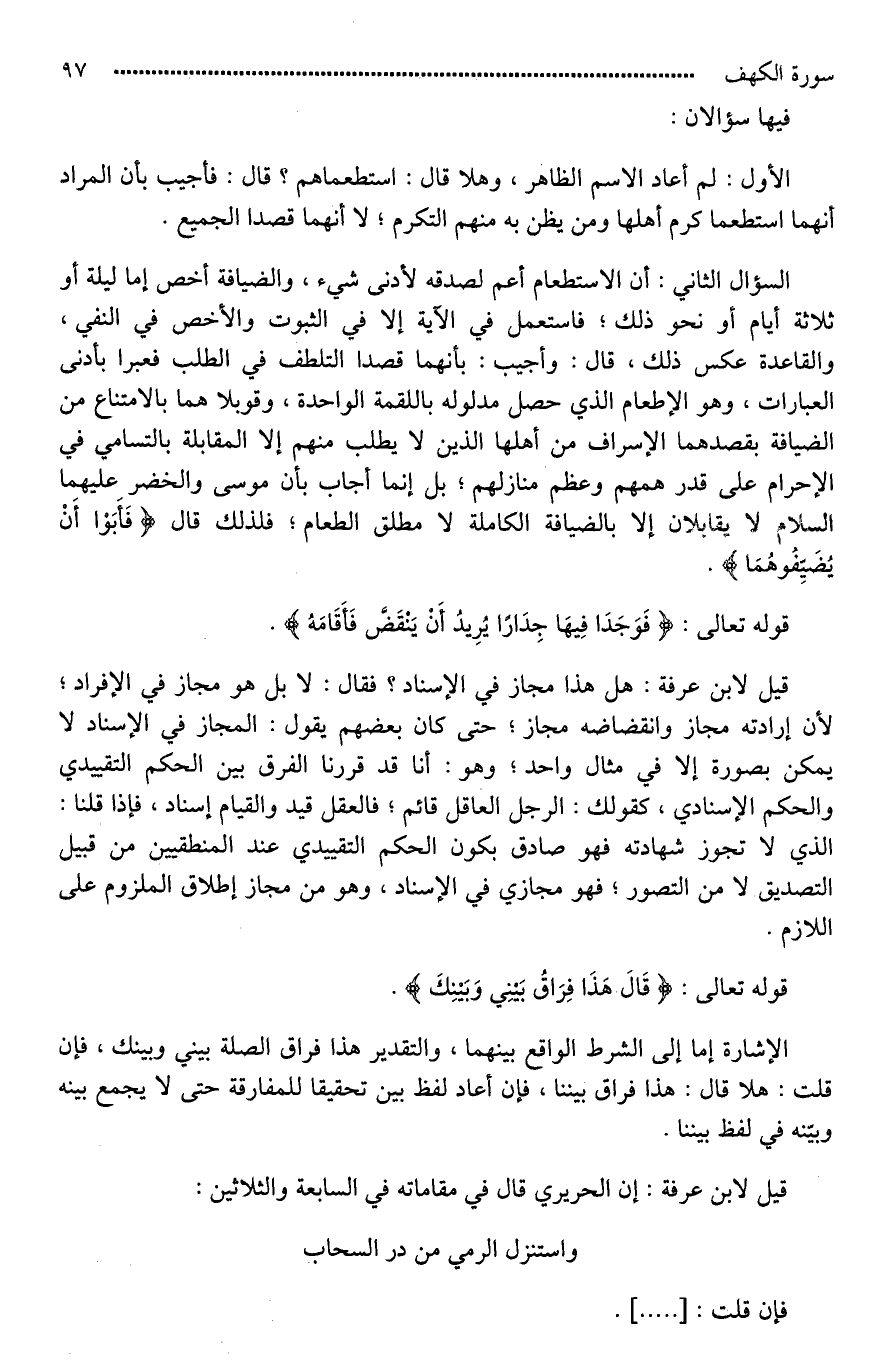 السؤال الثاني: أن الاستطعام أعم لصدقه لأدنى شيء، والضيافة أخص إما ليلة أو ثلاثة أيام أو نحو ذلك؛ فاستعمل في الآية إلا في الثبوت والأخص في النفي، والقاعدة عكس ذلك، قال: وأجيب: بأنهما قصدا التلطف في الطلب فعبرا بأدنى العبارات، وهو الإطعام الذي حصل مدلوله باللقمة الواحدة، وقوبلا هما بالامتناع من الضيافة بقصدهما الإسراف من أهلها الذين لَا يطلب منهم إلا المقابلة بالتسامي في [الإكرام*] على قدر همهم وعظم منازلهم؛ بل إنما أجاب بأن موسى والخضر عليهما السلام لَا يقابلان إلا بالضيافة الكاملة لَا مطلق الطعام؛ فلذلك قال (فَأَبَوْا أَنْ يُضَيِّفُوهُمَا).