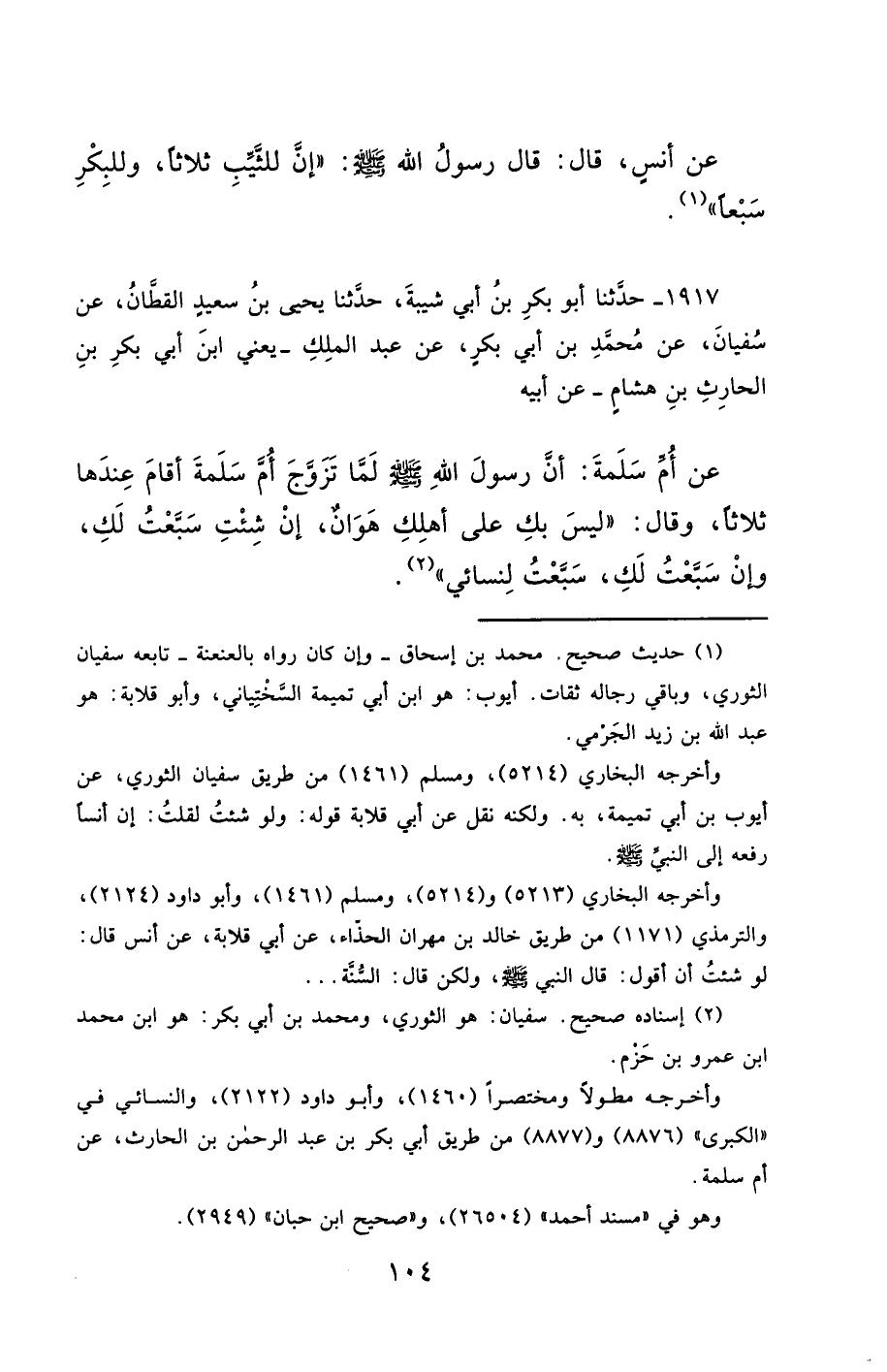 1917- حَدَّثَنَا أَبُو بَكْرِ بْنُ أَبِي شَيْبَةَ ، حَدَّثَنَا يَحْيَى بْنُ سَعِيدٍ الْقَطَّانُ ، عَنْ سُفْيَانَ ، عَنْ مُحَمَّدِ بْنِ أَبِي بَكْرٍ ، عَنْ عَبْدِ الْمَلِكِ , يَعْنِي ابْنَ أَبِي بَكْرِ بْنِ الْحَارِثِ بْنِ هِشَامٍ ، عَنْ أَبِيهِ ، عَنْ أُمِّ سَلَمَةَ ، أَنَّ رَسُولَ اللهِ صَلَّى الله عَليْهِ وسَلَّمَ لَمَّا تَزَوَّجَ أُمَّ سَلَمَةَ , أَقَامَ عِنْدَهَا ثَلاَثًا ، وَقَالَ : لَيْسَ بِكِ عَلَى أَهْلِكِ هَوَانٌ ، إِنْ شِئْتِ سَبَّعْتُ لَكِ ، وَإِنْ سَبَّعْتُ لَكِ سَبَّعْتُ لِنِسَائِي.