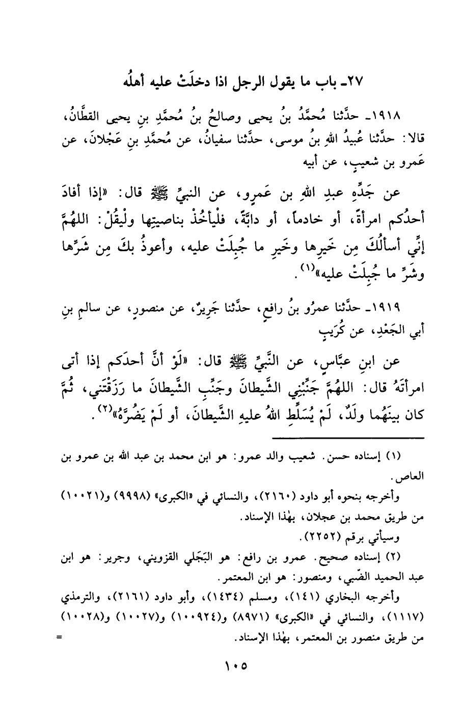 1919- حَدَّثَنَا عَمْرُو بْنُ رَافِعٍ ، حَدَّثَنَا جَرِيرٌ ، عَنْ مَنْصُورٍ ، عَنْ سَالِمِ بْنِ أَبِي الْجَعْدِ ، عَنْ كُرَيْبٍ ، عَنِ ابْنِ عَبَّاسٍ ، عَنِ النَّبِيِّ صَلَّى الله عَليْهِ وسَلَّمَ ، قَالَ : لَوْ أَنَّ أَحَدَكُمْ إِذَا أَتَى امْرَأَتَهُ ، قَالَ : اللَّهُمَّ جَنِّبْنِي الشَّيْطَانَ ، وَجَنِّبِ الشَّيْطَانَ مَا رَزَقْتَنِي ، ثُمَّ كَانَ بَيْنَهُمَا وَلَدٌ ، لَمْ يُسَلِّطِ اللَّهُ عَلَيْهِ الشَّيْطَانَ ، أَوْ لَمْ يَضُرَّهُ.