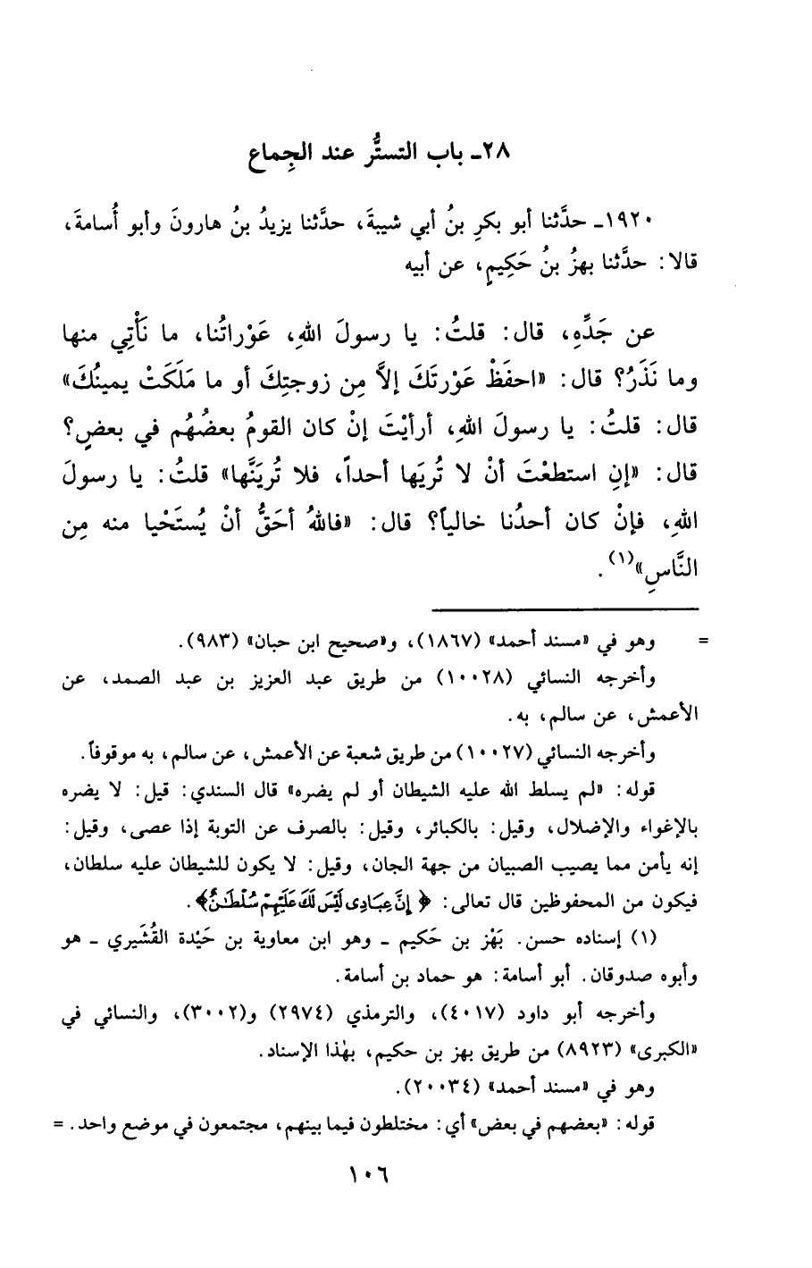 1920- حَدَّثَنَا أَبُو بَكْرِ بْنُ أَبِي شَيْبَةَ ، حَدَّثَنَا يَزِيدُ بْنُ هَارُونَ ، وَأَبُو أُسَامَةَ ، قَالاَ : حَدَّثَنَا بَهْزُ بْنُ حَكِيمٍ ، عَنْ أَبِيهِ ، عَنْ جَدِّهِ ، قَالَ : قُلْتُ : يَا رَسُولَ اللهِ ، عَوْرَاتُنَا ، مَا نَأْتِي مِنْهَا ، وَمَا نَذَرُ ؟ قَالَ : احْفَظْ عَوْرَتَكَ إِلاَّ مِنْ زَوْجَتِكَ ، أَوْ مَا مَلَكَتْ يَمِينُكَ ، قَالَ : قُلْتُ : يَا رَسُولَ اللهِ ، أَرَأَيْتَ إِنْ كَانَ الْقَوْمُ بَعْضُهُمْ فِي بَعْضٍ ؟ قَالَ : إِنِ اسْتَطَعْتَ أَنْ لاَ تُرِيَهَا أَحَدًا ، فَلاَ تُرِيَنَّهَا ، قُلْتُ : يَا رَسُولَ اللهِ ، فَإِنْ كَانَ أَحَدُنَا خَالِيًا ؟ قَالَ : فَاللَّهُ أَحَقُّ أَنْ يُسْتَحْيَا مِنْهُ مِنَ النَّاسِ.