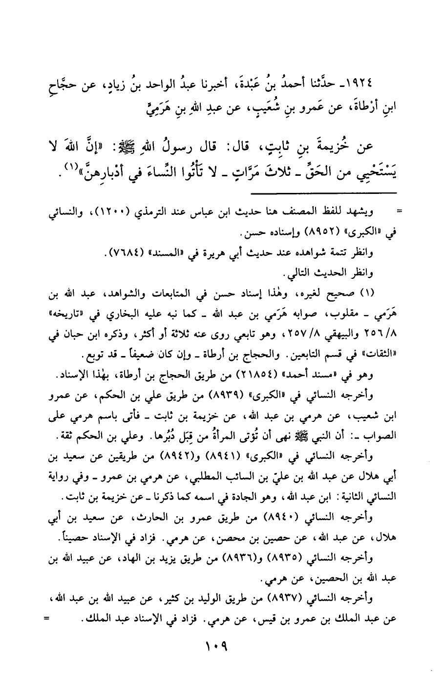 1924- حَدَّثَنَا أَحْمَدُ بْنُ عَبْدَةَ ، أَخْبَرَنَا عَبْدُ الْوَاحِدِ بْنُ زِيَادٍ ، عَنْ حَجَّاجِ بْنِ أَرْطَاةَ ، عَنْ عَمْرِو بْنِ شُعَيْبٍ ، عَنْ عَبْدِ اللهِ بْنِ هَرَمِيٍّ ، عَنْ خُزَيْمَةَ بْنِ ثَابِتٍ ، قَالَ : قَالَ رَسُولُ اللهِ صَلَّى الله عَليْهِ وسَلَّمَ : إِنَّ اللَّهَ لاَ يَسْتَحْيِي مِنَ الْحَقِّ ، ثَلاَثَ مَرَّاتٍ ، لاَ تَأْتُوا النِّسَاءَ فِي أَدْبَارِهِنَّ.