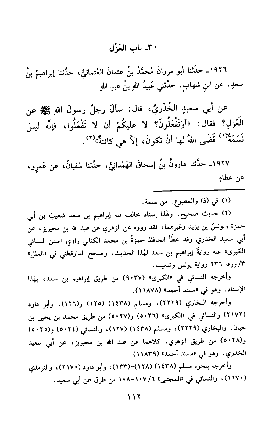 1926- حَدَّثَنَا أَبُو مَرْوَانَ مُحَمَّدُ بْنُ عُثْمَانَ الْعُثْمَانِيُّ ، حَدَّثَنَا إِبْرَاهِيمُ بْنُ سَعْدٍ ، عَنِ ابْنِ شِهَابٍ , حَدَّثَنِي عُبَيْدُ اللهِ بْنُ عَبْدِ اللهِ ، عَنْ أَبِي سَعِيدٍ الْخُدْرِيِّ ، قَالَ : سَأَلَ رَجُلٌ رَسُولَ اللهِ صَلَّى الله عَليْهِ وسَلَّمَ عَنِ الْعَزْلِ ، فَقَالَ : أَوَتَفْعَلُونَ ؟ لاَ عَلَيْكُمْ أَنْ لاَ تَفْعَلُوا ، فَإِنَّهُ لَيْسَ نَسَمَةٌ قَضَى اللَّهُ لَهَا أَنْ تَكُونَ ، إِلاَّ هِيَ كَائِنَةٌ.