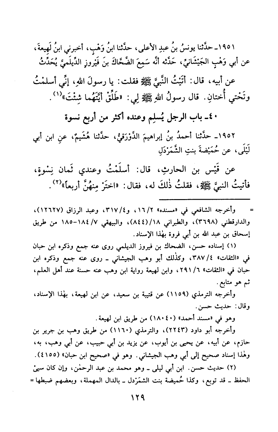 1951- حَدَّثَنَا يُونُسُ بْنُ عَبْدِ الأَعْلَى ، حَدَّثَنَا ابْنُ وَهْبٍ ، أَخْبَرَنِي ابْنُ لَهِيعَةَ ، عَنْ أَبِي وَهْبٍ الْجَيْشَانِيِّ حَدَّثَهُ , أَنَّهُ سَمِعَ الضَّحَّاكَ بْنَ فَيْرُوزَ الدَّيْلَمِيَّ يُحَدِّثُ عَنْ أَبِيهِ ، قَالَ : أَتَيْتُ النَّبِيَّ صَلَّى الله عَليْهِ وسَلَّمَ فَقُلْتُ : يَا رَسُولَ اللهِ ، إِنِّي أَسْلَمْتُ وَتَحْتِي أُخْتَانِ ، قَالَ رَسُولُ اللهِ صَلَّى الله عَليْهِ وسَلَّمَ لِي : طَلِّقْ أَيَّتَهُمَا شِئْتَ.