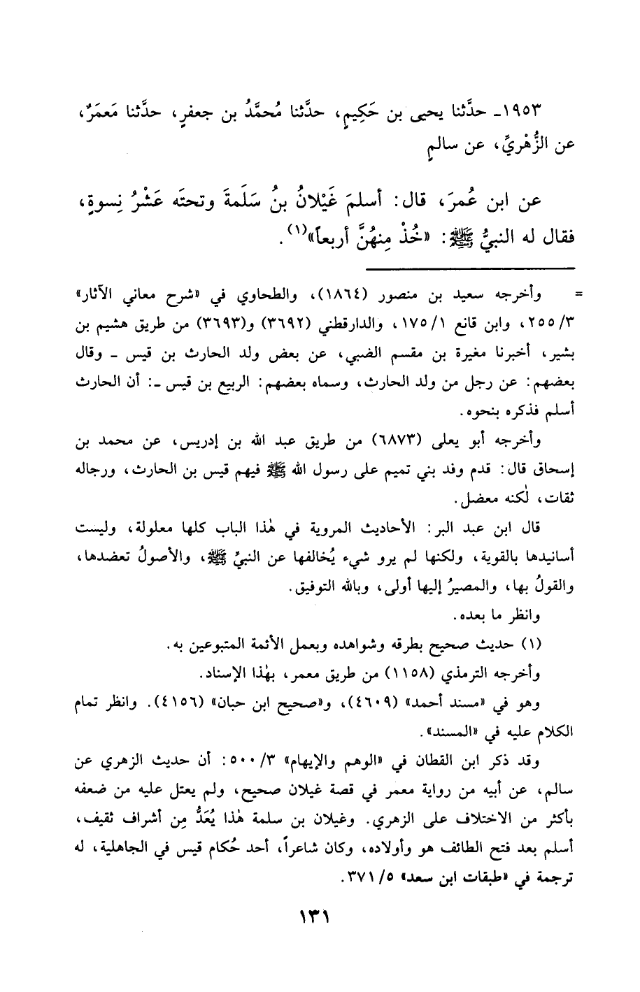 1953- حَدَّثَنَا يَحْيَى بْنُ حَكِيمٍ ، حَدَّثَنَا مُحَمَّدُ بْنُ جَعْفَرٍ ، حَدَّثَنَا مَعْمَرٌ ، عَنِ الزُّهْرِيِّ ، عَنْ سَالِمٍ ، عَنِ ابْنِ عُمَرَ ، قَالَ : أَسْلَمَ غَيْلاَنُ بْنُ سَلَمَةَ وَتَحْتَهُ عَشْرُ نِسْوَةٍ ، فَقَالَ لَهُ النَّبِيُّ صَلَّى الله عَليْهِ وسَلَّمَ : خُذْ مِنْهُنَّ أَرْبَعًا.